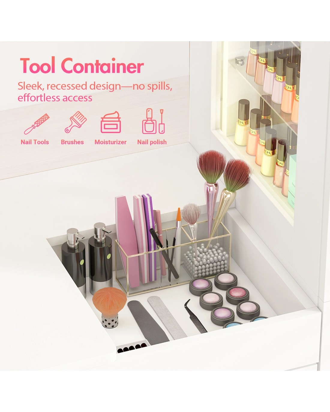 Spacious and Flexible Storage: Designed with a recessed storage tool container and ample storage options including 2 drawers, 2 cabinets, and open storage spaces. This maximizes storage space, keeping your nail tools and supplies organized and