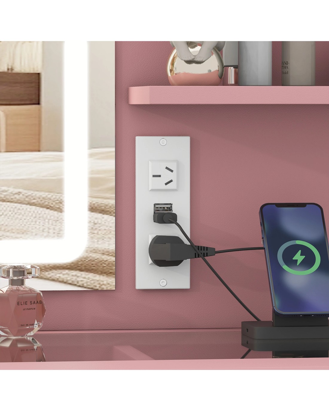 Smart HD mirror for easy makeup. There are three lighting modes to choose from, including warm yellow, warm white and cold white, touch the switch to adjust the light color, and long press the switch to adjust the light brightness. The tempered glass desktop design can not only provide enough desktop storage space, but also clearly display the items stored in the drawer, no longer need to worry about finding the items. Storage and charging in one vanity with a charging station and 2 USB ports for simultaneous charging of your phone, desk lamp or hairdryer. 5 individual drawers and 2 open shelves make it easy to organize your beauty essentials.