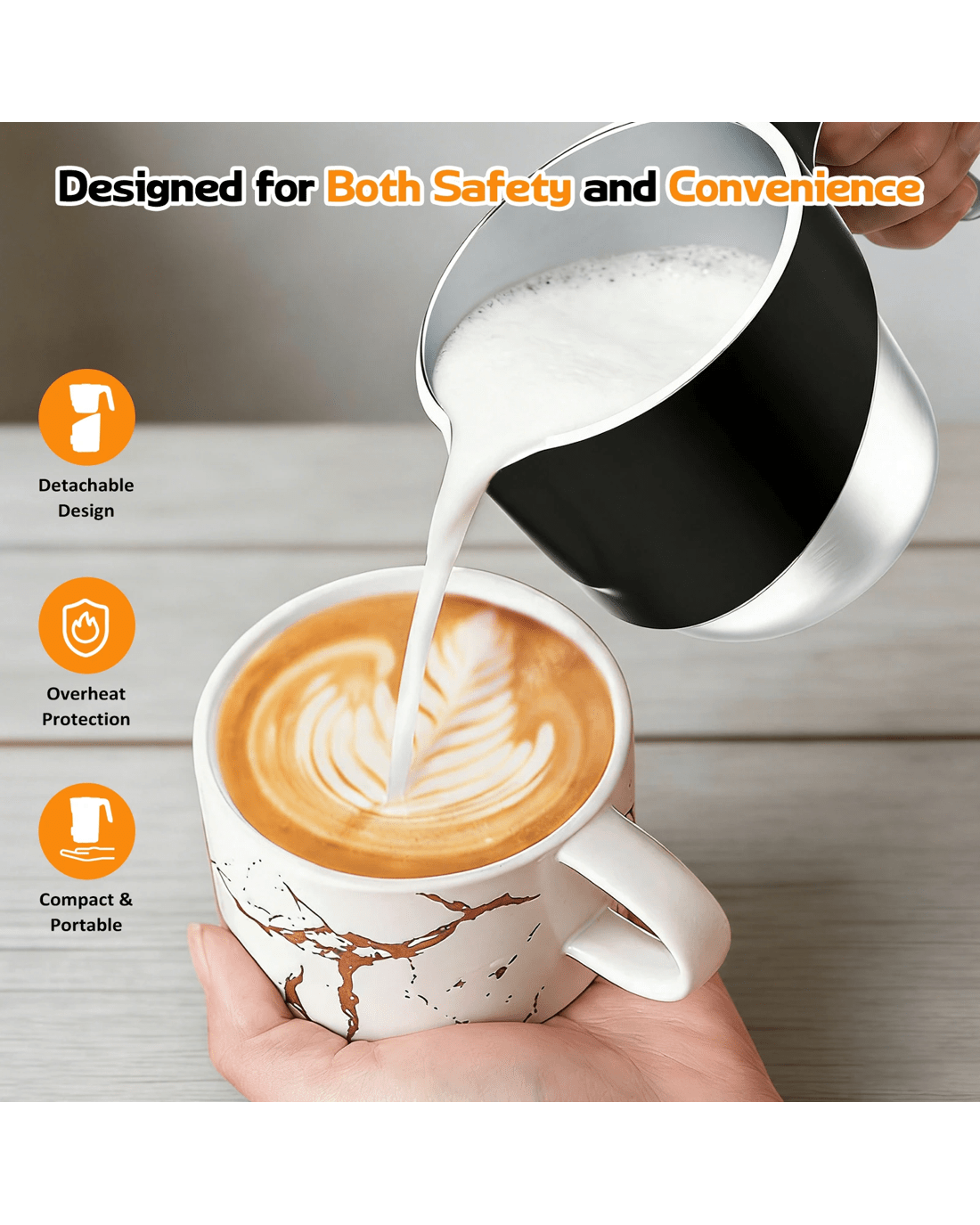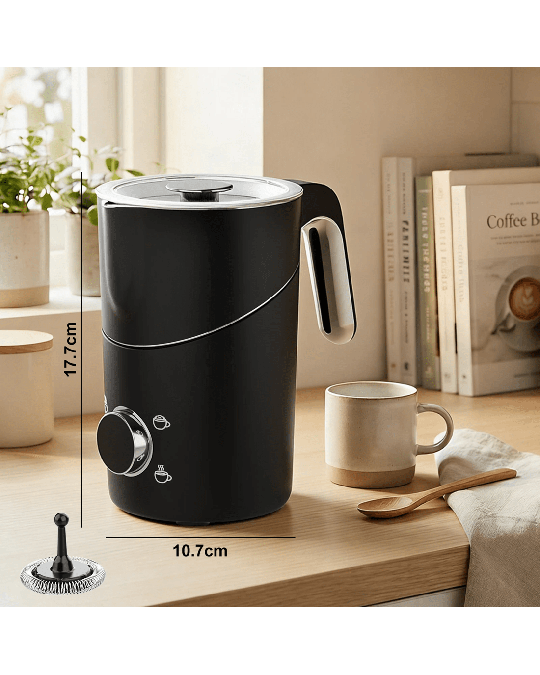 This electric milk frother operates quietly and features a non-stick coating for easy cleaning. Built-in temperature control and overheat protection ensure safe daily use. Designed for consistent frothing results whether you prefer dairy, almond milk, soy milk, oat milk, or other plant-based options.