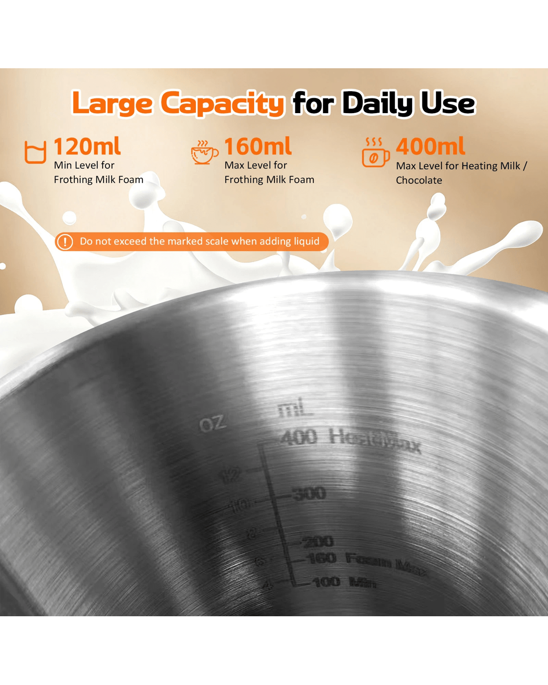 Designed with a detachable upper frothing jug, this milk frother lets you use the top container as both the frothing vessel and a latte art jug. You can lift it at any time during frothing to pour directly for latte art. Froths 120–160 ml and heats up to 400 ml—compact for home, office, travel, and RV use.
