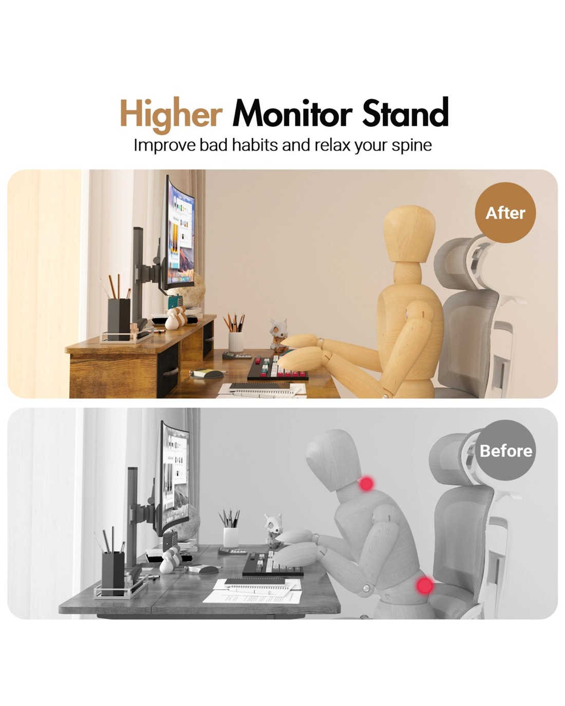 2-Layer Storage Monitor Stand: Standing desktop integrated monitor stand increases our visual range, protects eyesight and relieves neck fatigue. And it makes full use of space, with 2 removable cloth drawers that cleverly make your desktop