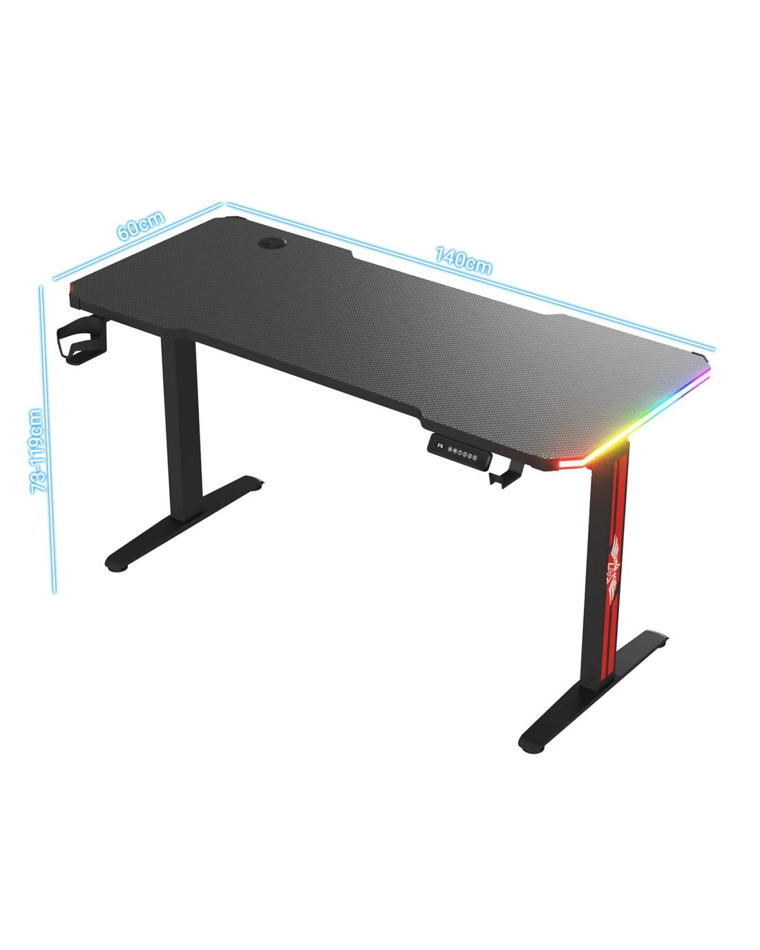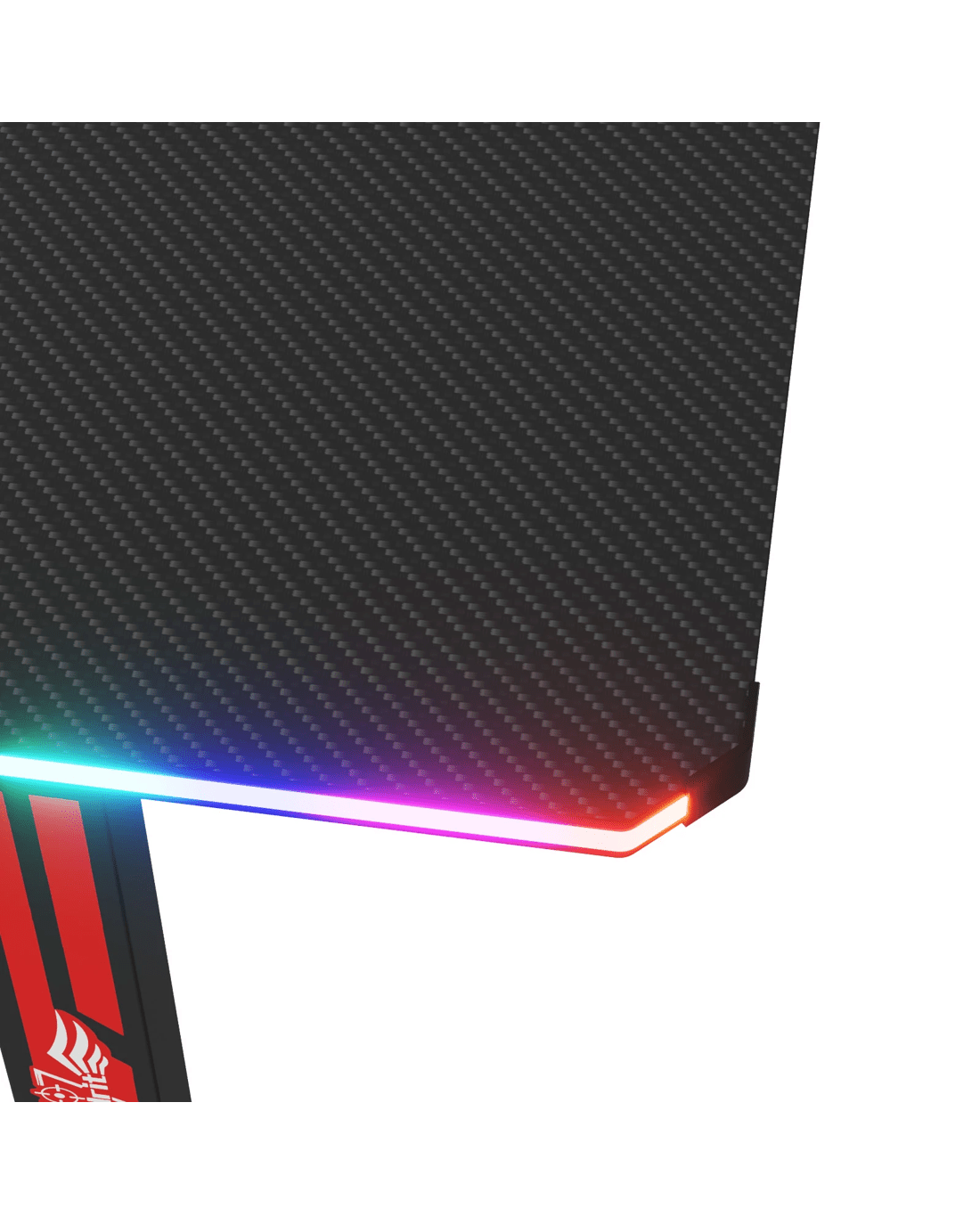between your preferred sitting and standing heights, and experience the comfort of seamless height adjustment. The unique U-shaped carbon fiber desktop allows for a more comfortable body position, and the distinctive built-in RGB LED lighting on the