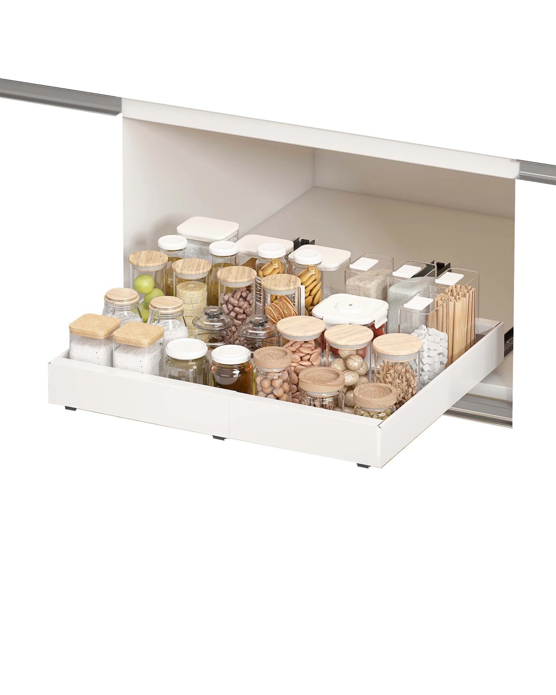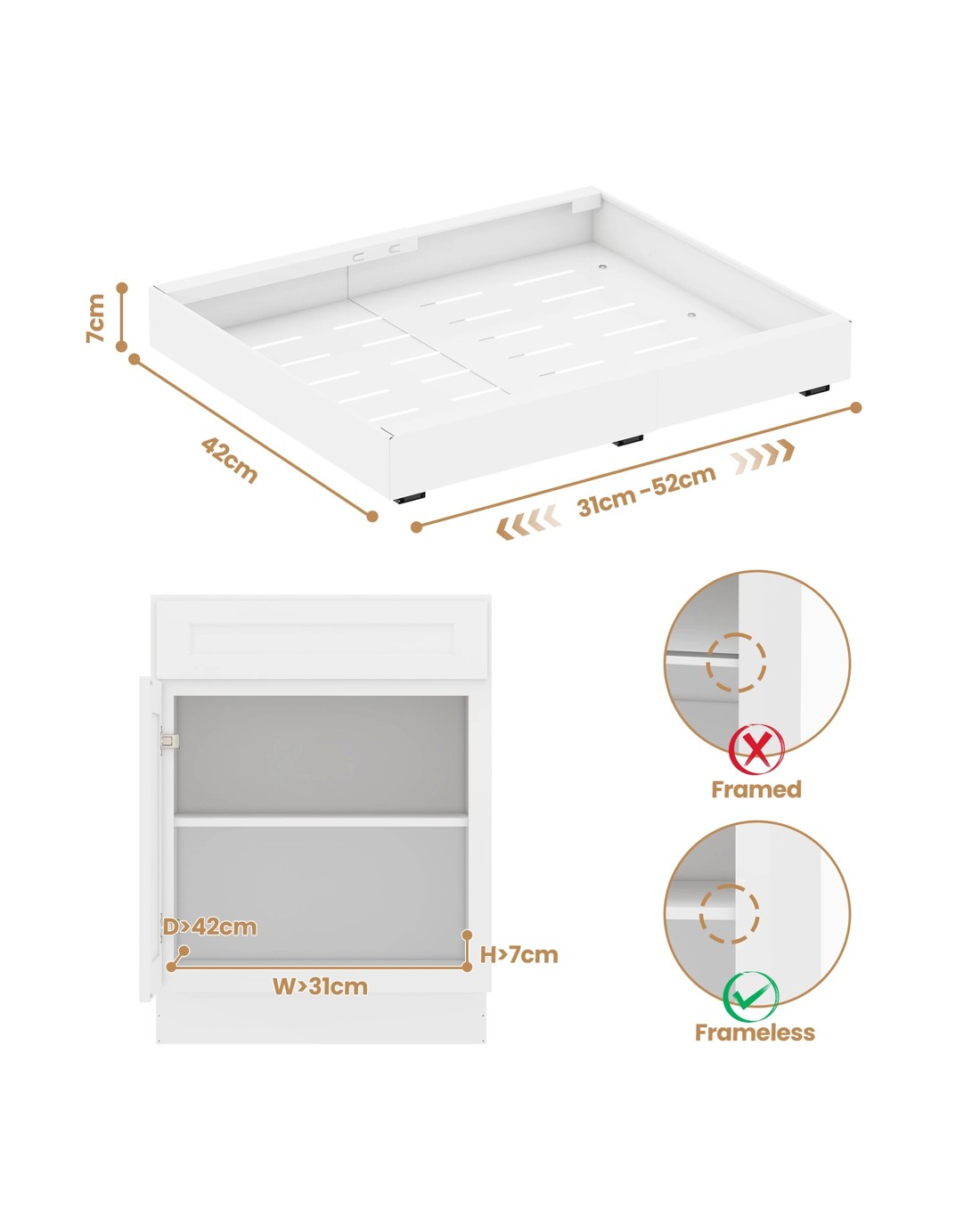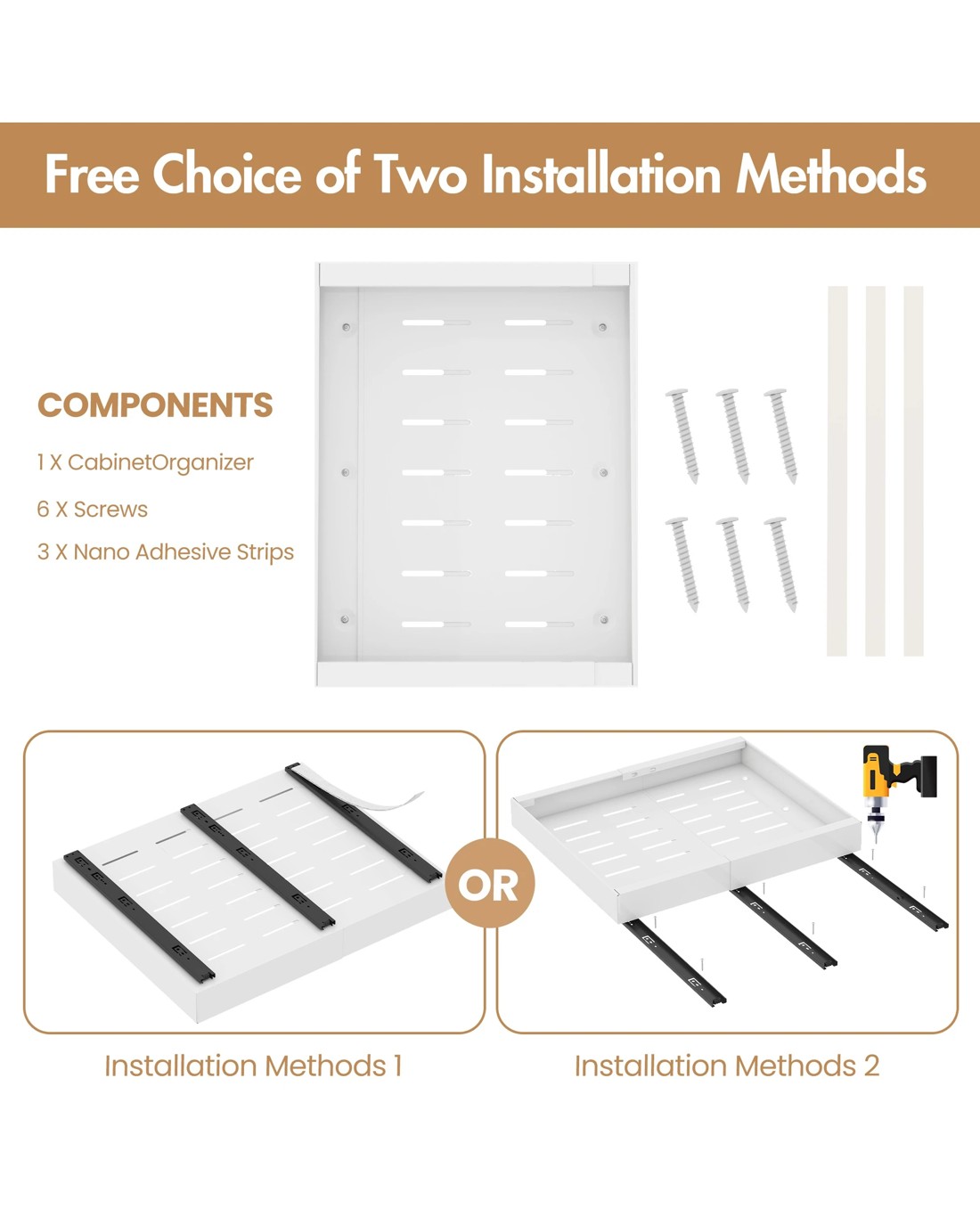This pull out cabinet organizer comes with screws and nano adhesive strips, free choice of two installation methods. The heavy duty carbon steel pull out cabinet organizer is painted with excellent spray paint for excellent rust resistance for long term use. The pantry organizer can be expanded from 31cm to52cm. You can easily adjust it to fit different kitchen cabinets.Built with upgrade 3 slide rails ,this pull out drawers for cabinets provides strong support and quiet performance. Perfect for kitchen, office, bathroom, pantry - assemble in minutes to make your cabinet storage more efficient!