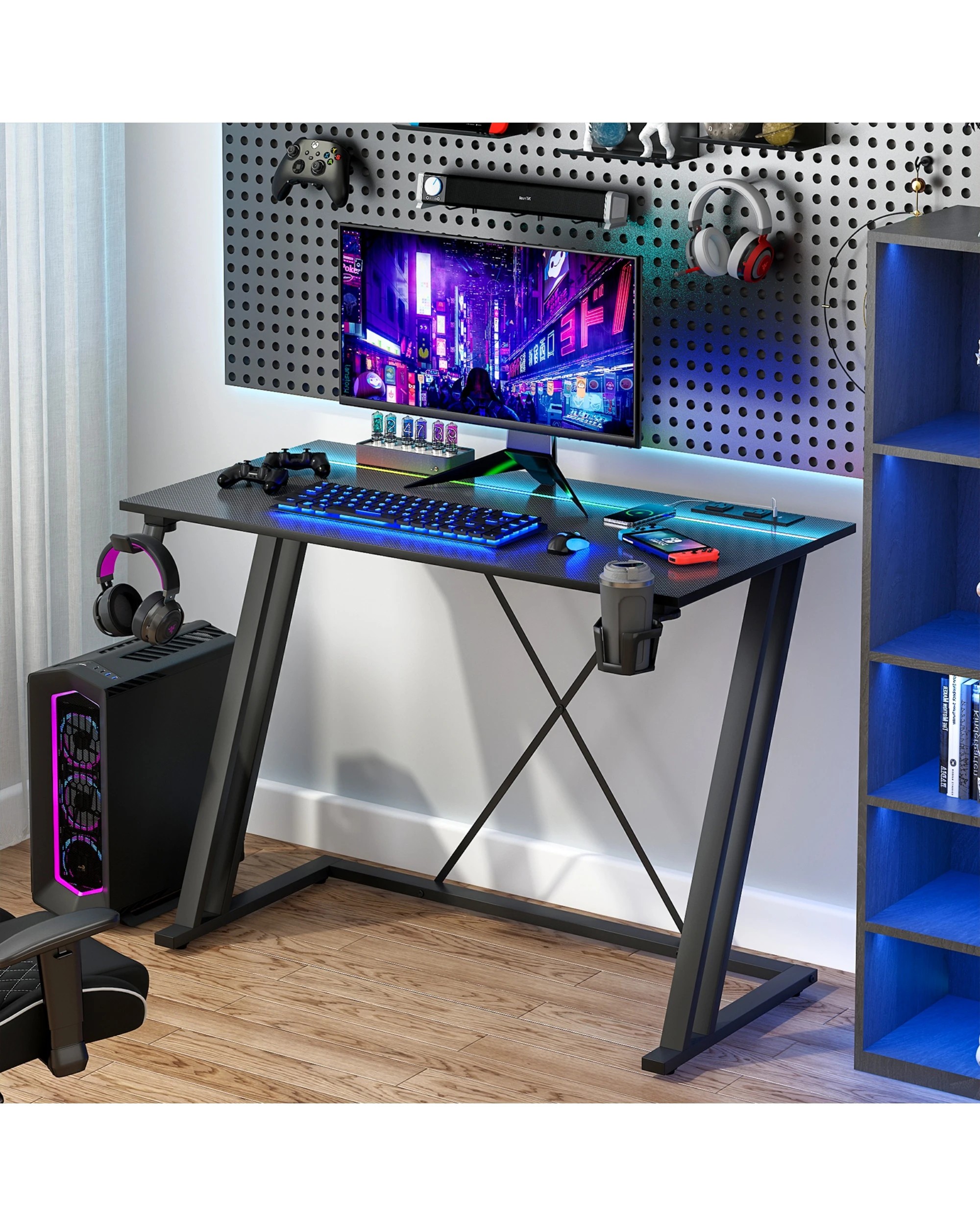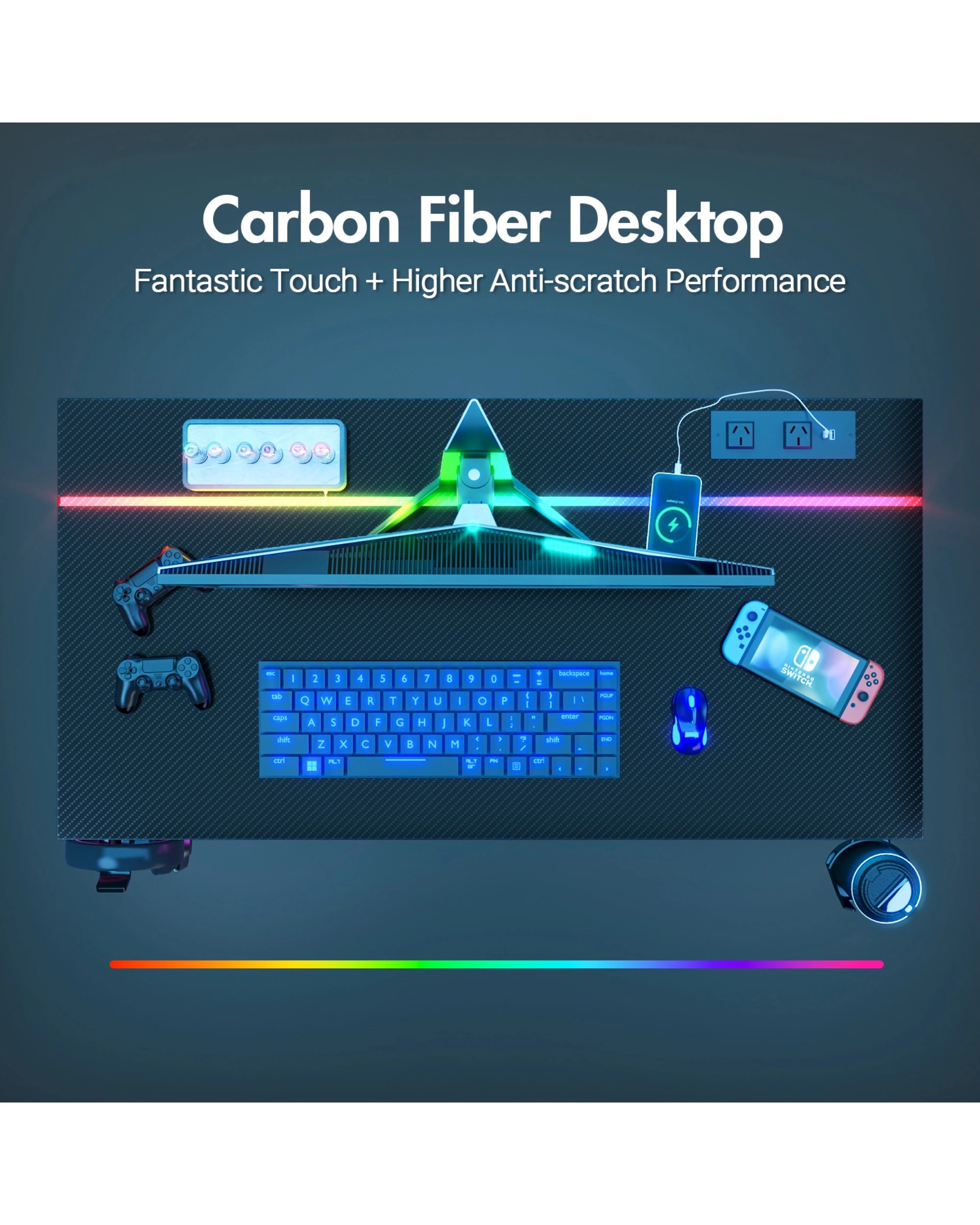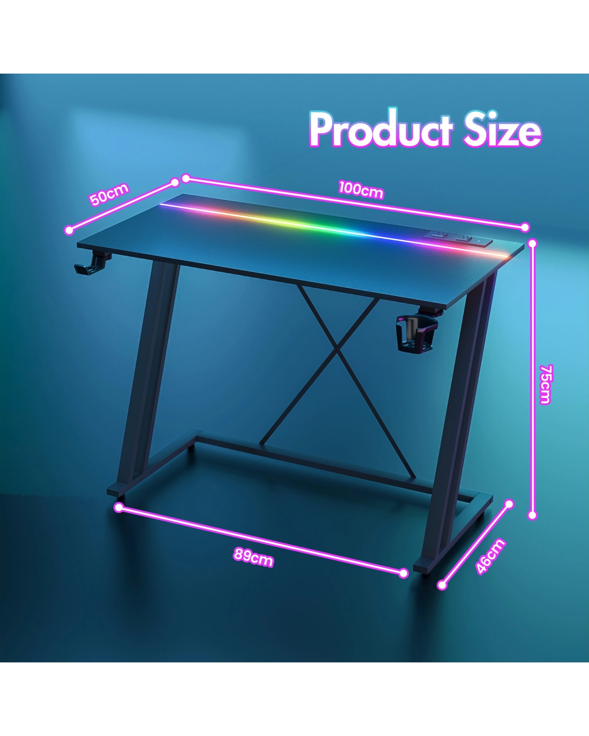 Advwin Gaming Desk Built-in Led Lights & Power Outlets 100cm Carbon Fiber Surface Computer Desk Black
