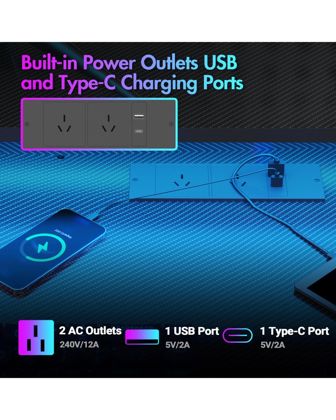 The integrated LED lights add an immersive ambiance, while the built-in power outlets, USB and Type-C ports ensure your devices are always charged and ready. Perfect for gamers, workers, and professionals, this desk features built-in storage shelves,