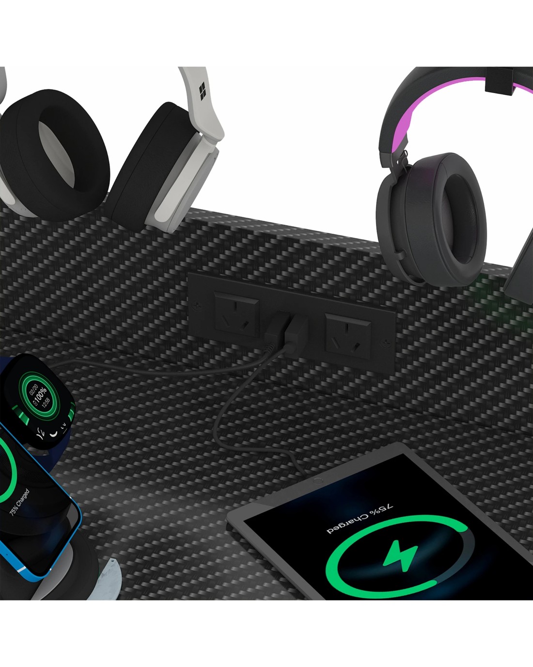 The integrated LED lights add an immersive ambiance, while the built-in power outlets, USB ports ensure your devices are always charged and ready. Perfect for gamers, workers, and professionals, this desk features built-in storage shelves, blending practicality with sleek design.