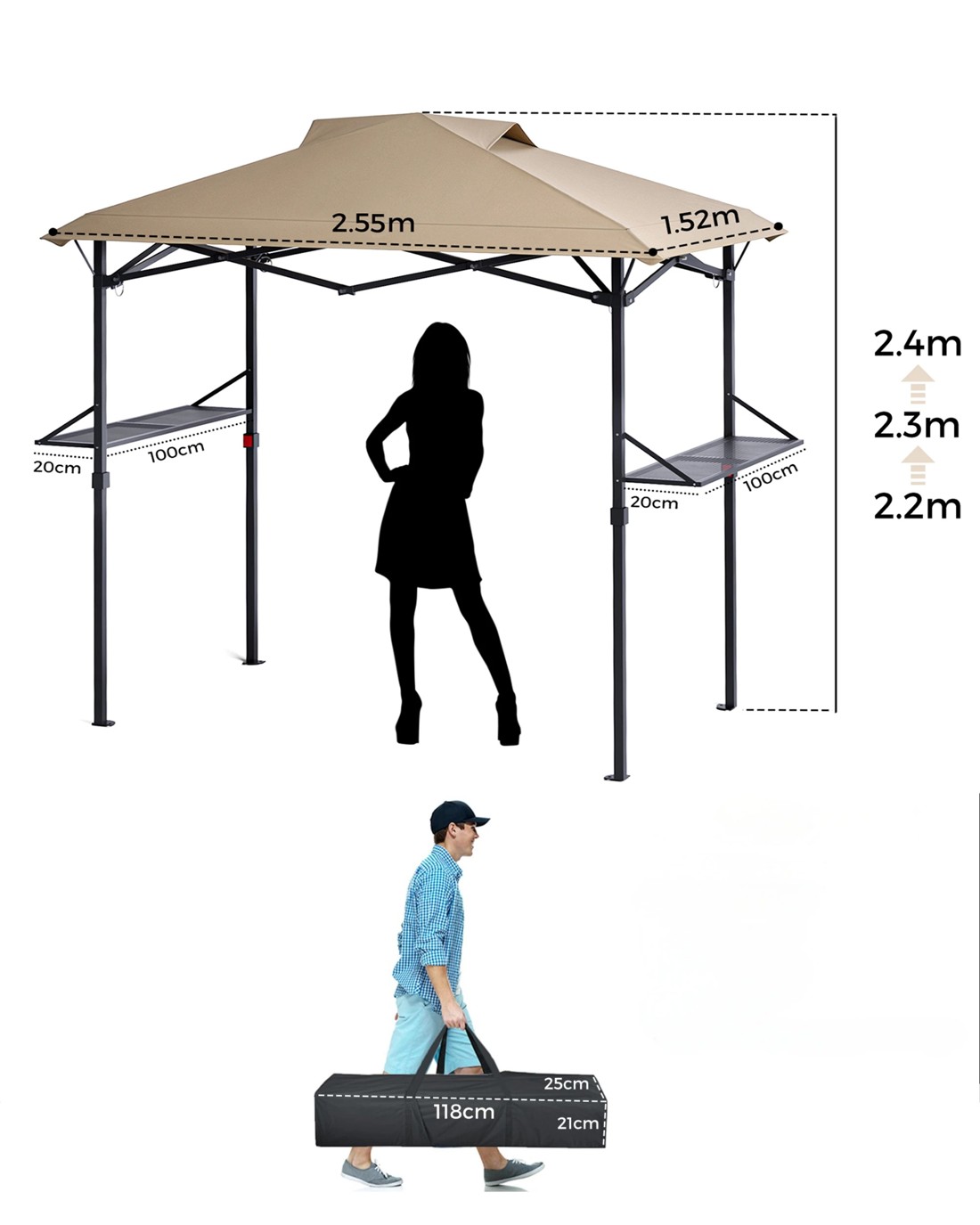 Easy Assembly : Setting up this BBQ Gazebo is simple. The frame uses foldable design, and the canopy easy setup. When the grilling season is over or you need to store it away, the gazebo folds down compactly and fits into the included black portable carry bag. The carry bag is lightweight and easy to transport.