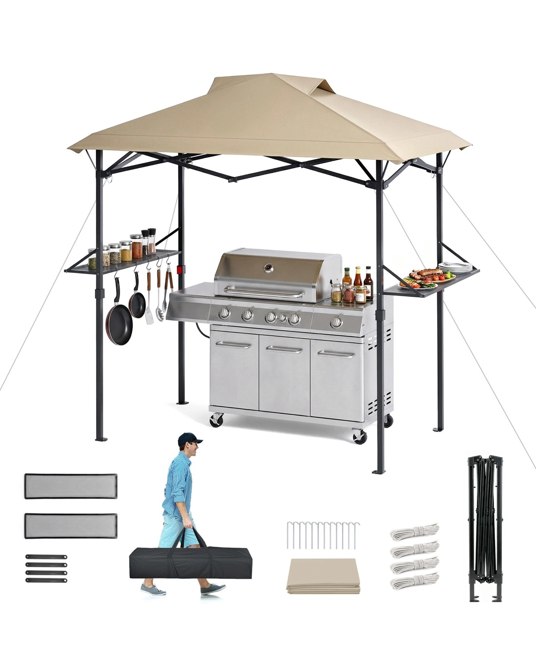 Double-Tiered Vented Top : The BBQ gazebo features a double-layered soft top made of polyester fabric with waterproof coating.The double-tiered vented structure creates airflow that pulls smoke up and out of the gazebo, preventing smoke buildup. The waterproof polyester fabric with PA coating repels light rain, keeping you dry during sudden showers, while also being sun-proof to block harsh UV rays-protecting your skin.
