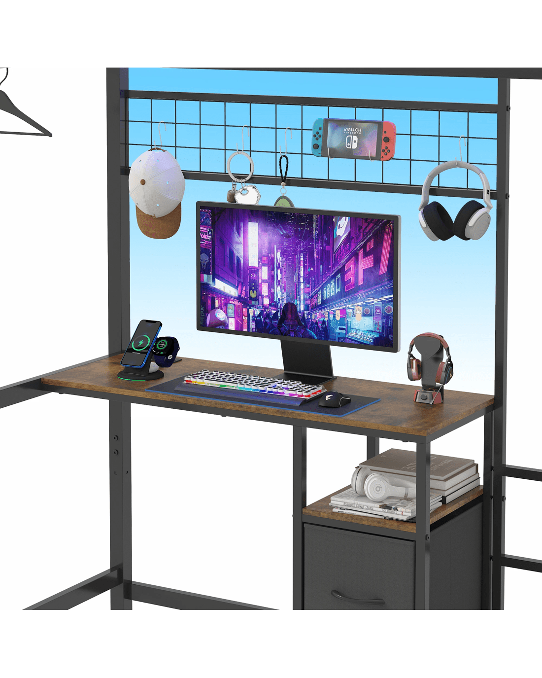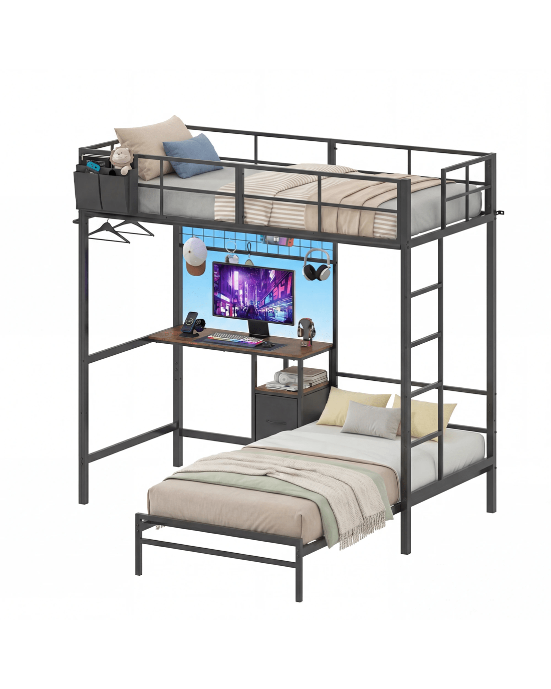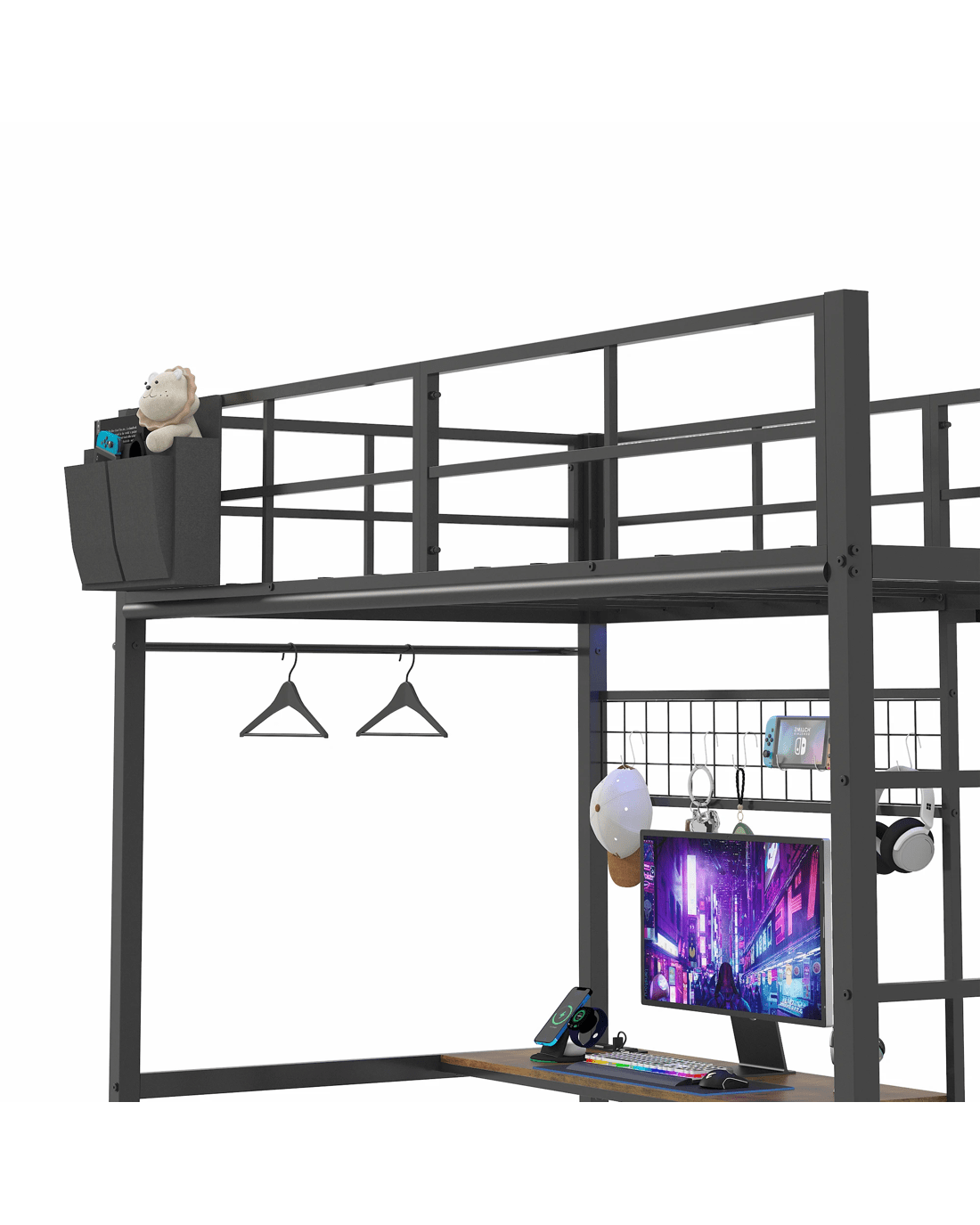 Built-in Desk and Charging Station: High sleeper smartly combines a desk with a built-in charging station, providing ample space for laptops, monitors, or tablets. The integrated charging station includes 2 AC outlets, 1 USB port, and 1 Type-C port—perfect for keeping your devices powered while studying, working, or gaming.