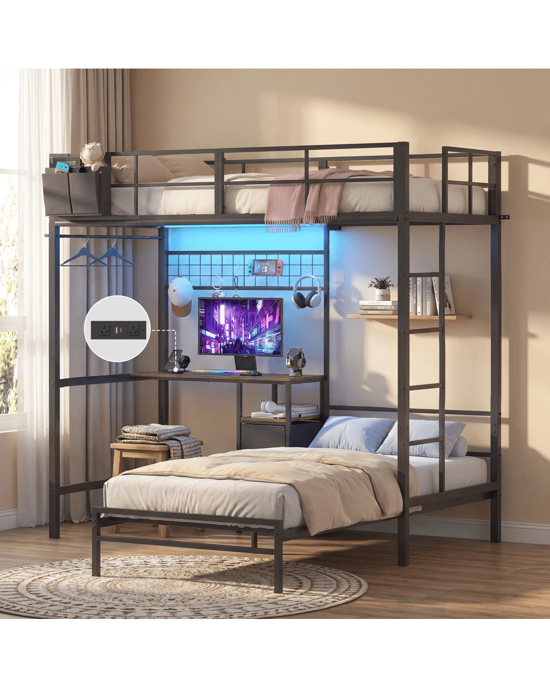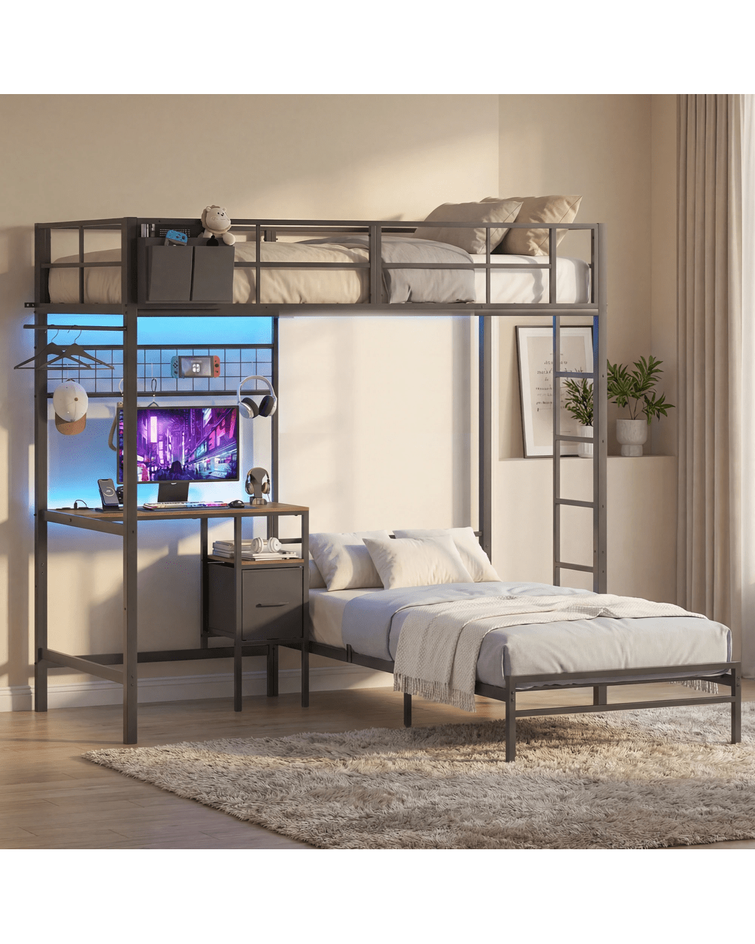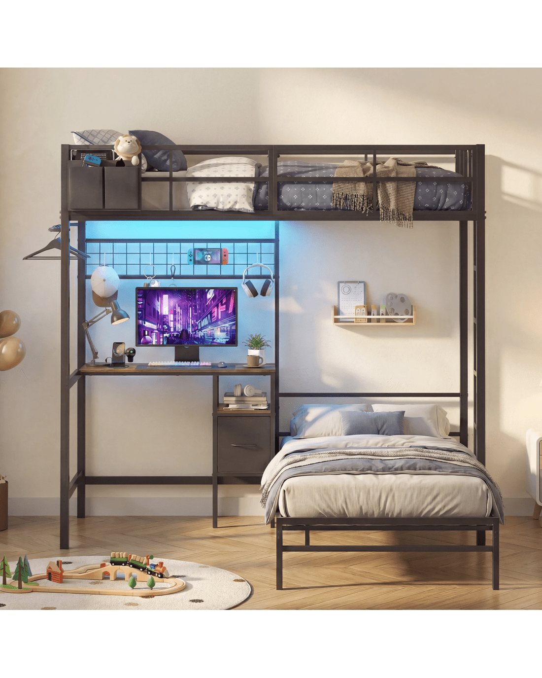 The smart single-over-single design creates two private sleeping zones while optimizing floor space, perfect for modern homes or dorms. Enjoy a built-in desk with 2 AC outlets, USB, Type-C ports, fabric drawers, open shelves, a clothes rail, metal grid with 6 hooks, and a removable bedside pocket for ultimate organization. A customizable LED strip with 60,000 colors, brightness control, music sync, and dynamic effects adds a touch of luxury.Elegant, practical, and family-ready, it transforms any room into a chic, organized retreat.