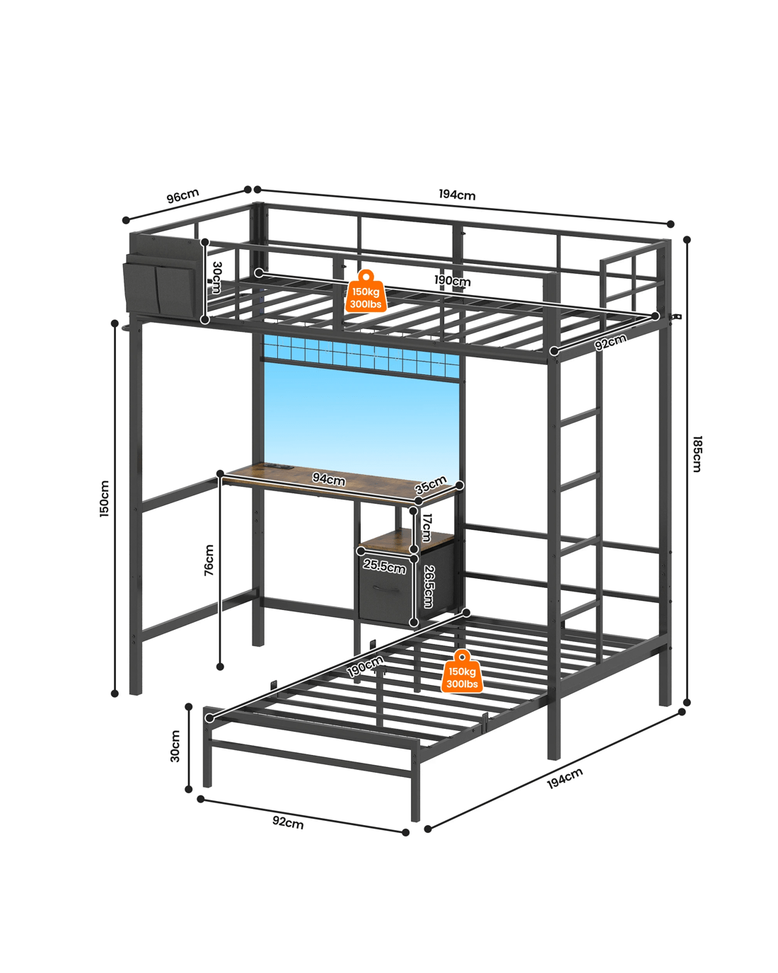 Sold by AdvwinAdvwin L-Shaped Bunk Bed with Desk Charging Station LED Light King Single - Black