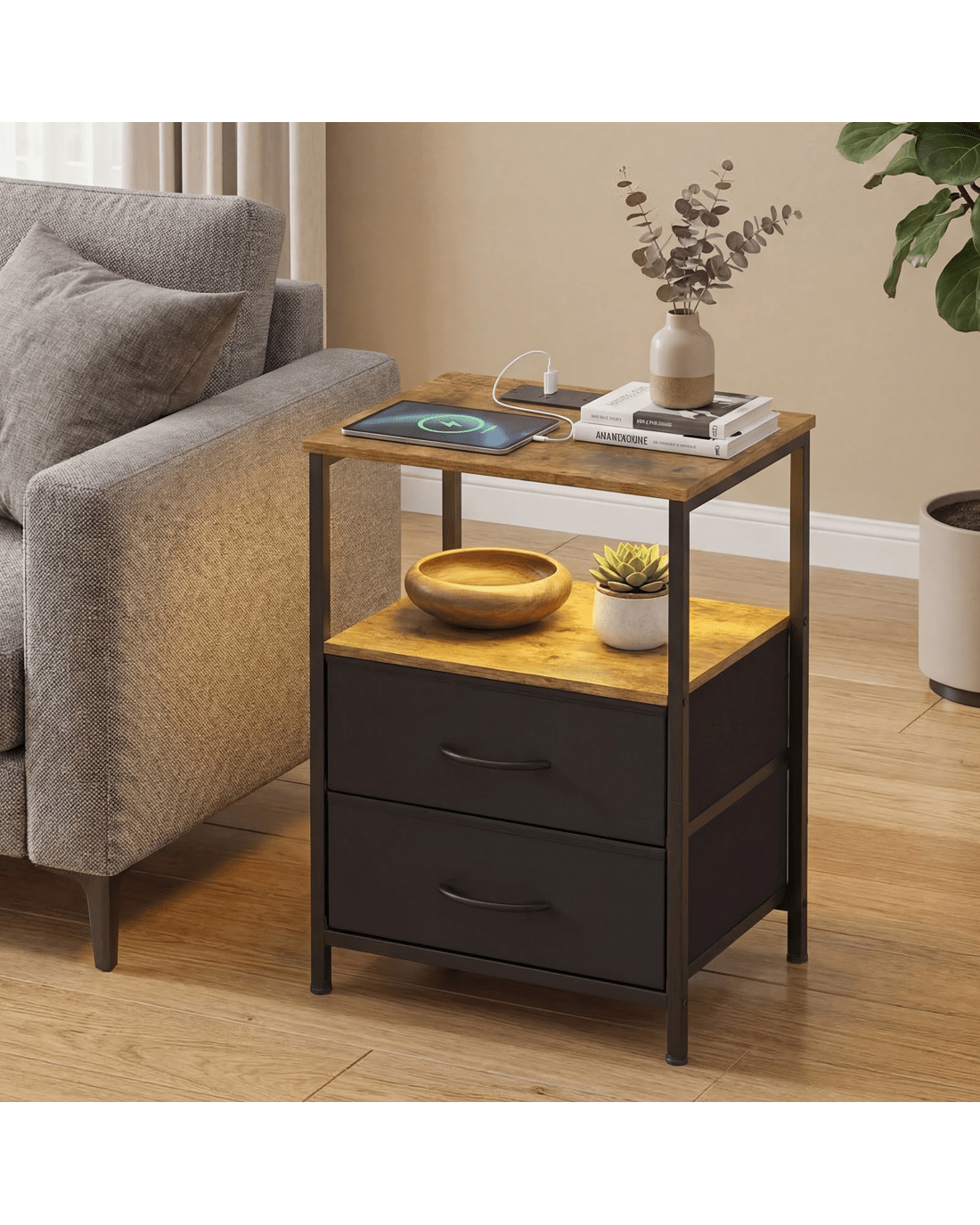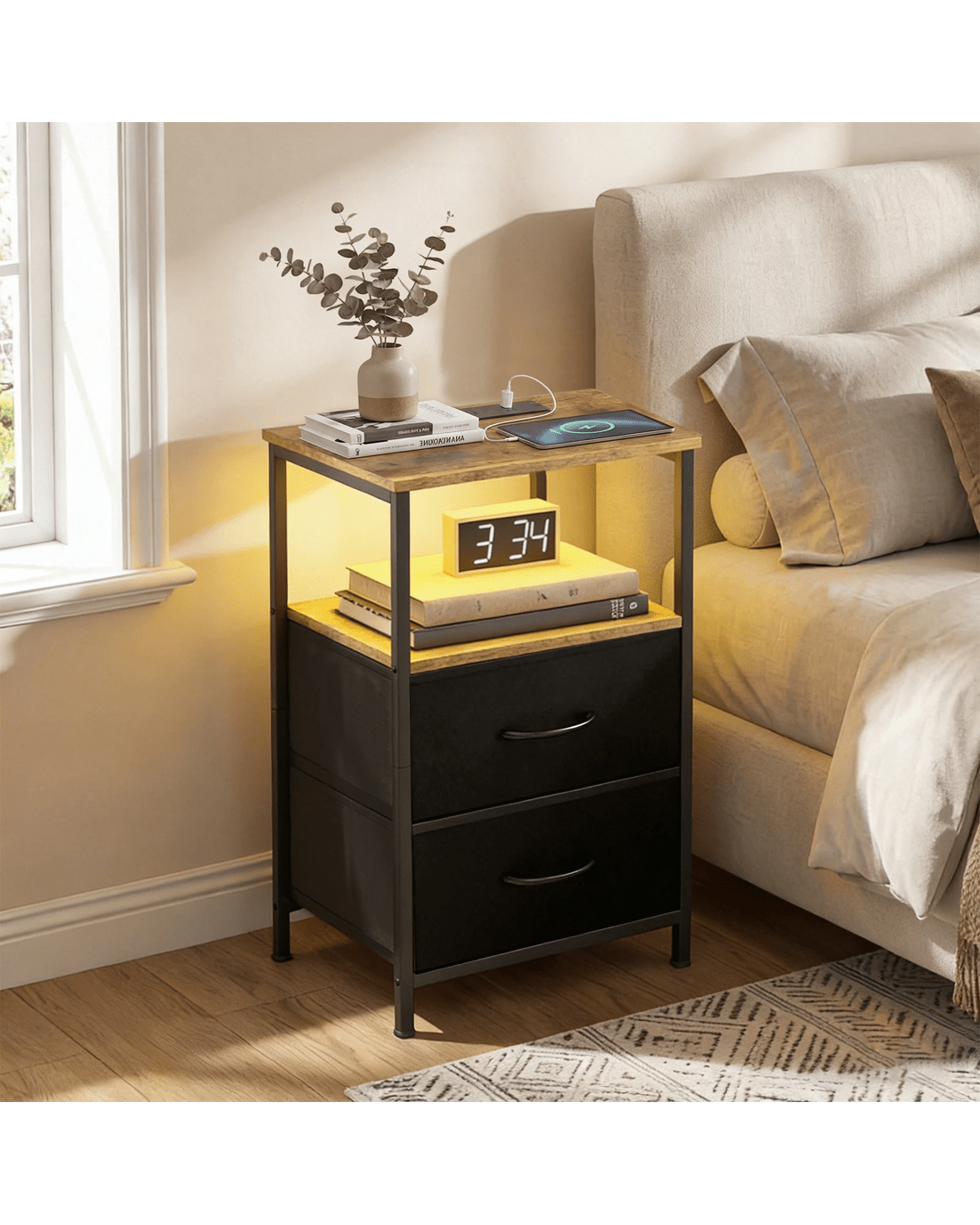 Introducing the Advwin LED Bedside Table, a multi-functional piece of furniture that combines a convenient charging station with a stylish nightstand. This rustic brown table features an integrated LED lamp with 20 RGB colors and 21 light modes, offering adjustable brightness to enhance your bedroom ambiance. With 2 standard sockets and 2 USB ports on the top shelf, it's the perfect spot to charge your devices while keeping them within reach. The 2 fabric drawers provide quiet, smooth storage for essentials like books, glasses, and alarm clocks, and the sturdy particleboard construction with a metal frame ensures durability, supporting up to 15kg on the table top and 3kg per drawer. Adjustable feet protect your floors, and its versatility allows it to serve as a coffee table or side table in various settings. The industrial design is easy to match with existing furniture, and it comes with all accessories and clear instructions for easy assembly.