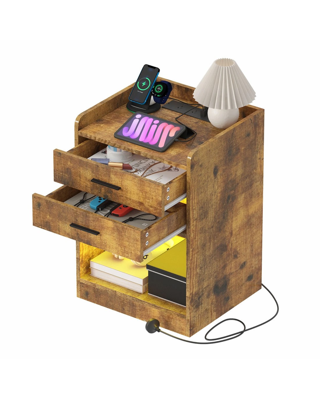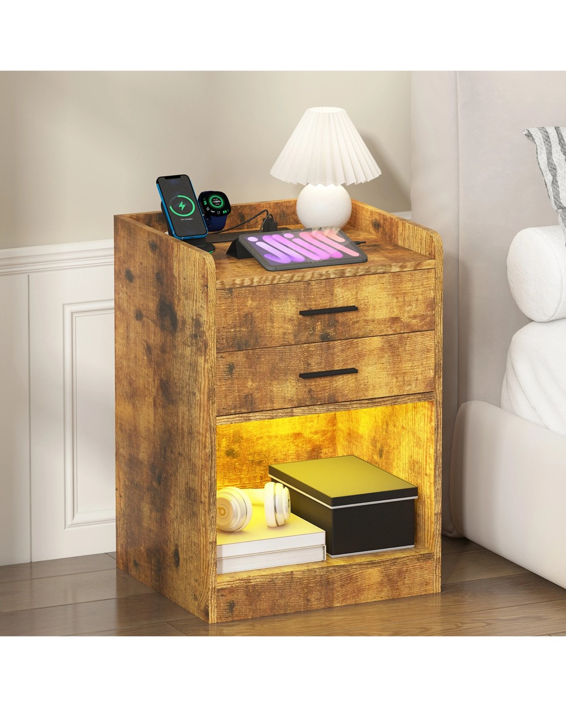 Convenient Charging Station:The bedside table's top shelf features 2 AC and 2 USB ports, providing convenient charging options for your electronic devices. Keep your phone, tablet, or other gadgets powered up and within reach throughout the night.