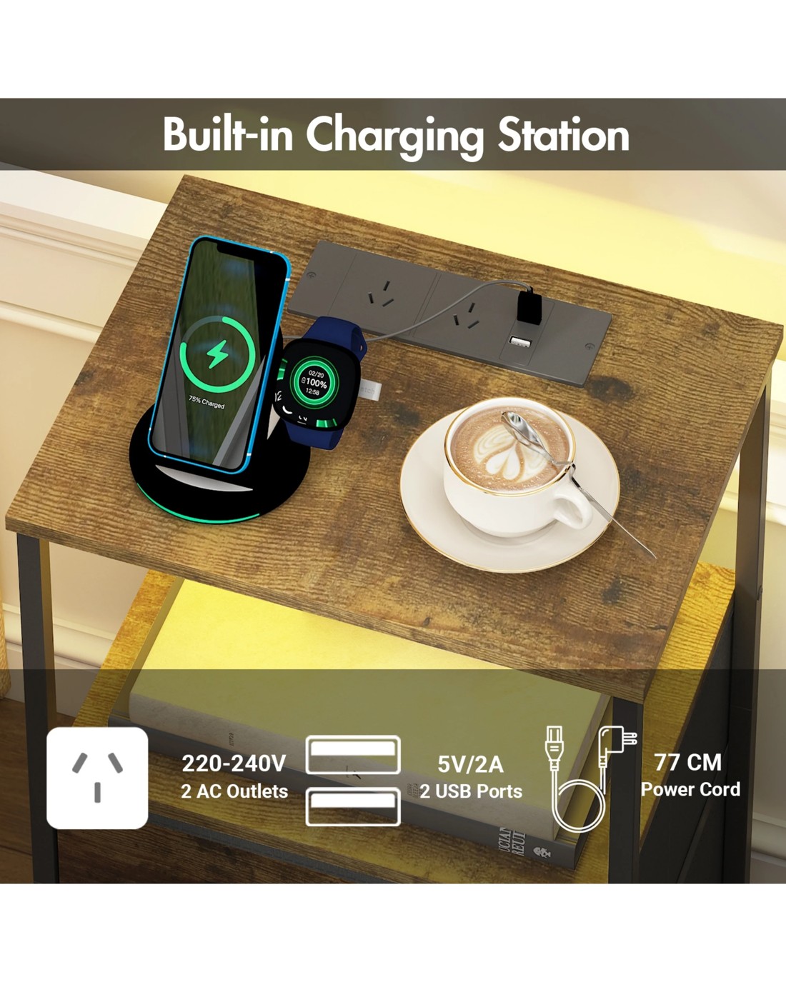 Built-in Charging Station: 2 USB Ports[5V/2A]; 2 AC 0utlets[240V/10A]; 77 CM Power cord