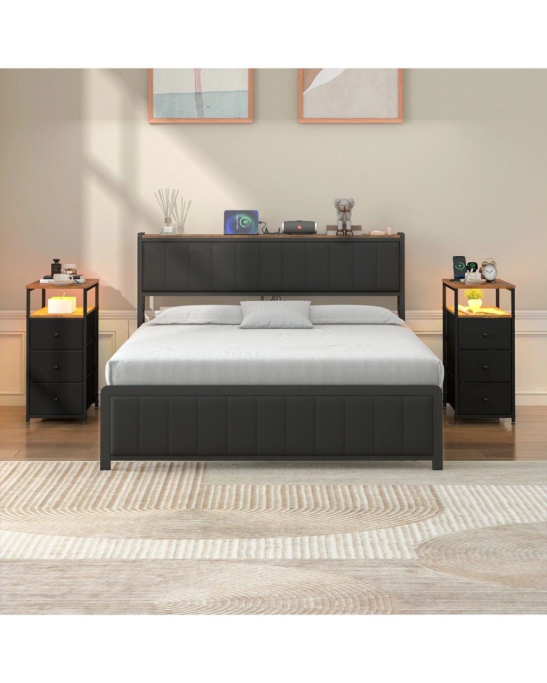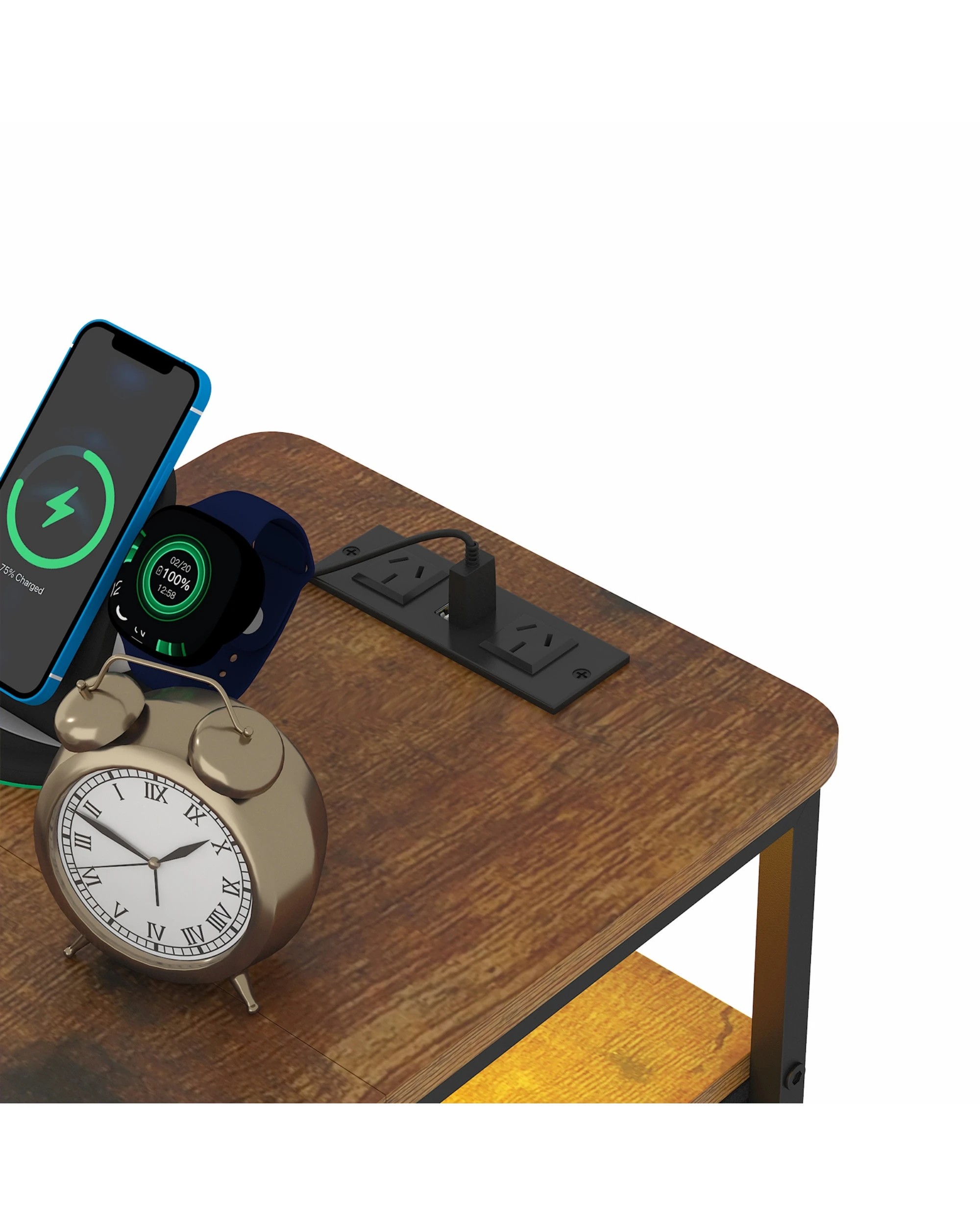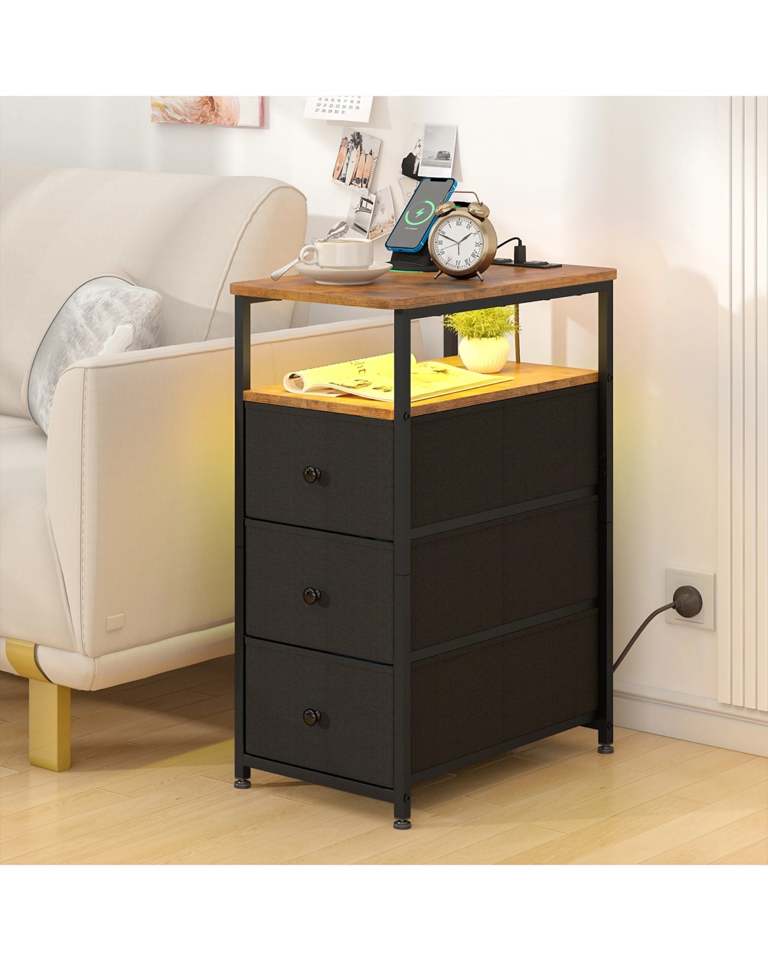 Advwin LED End Table Sofa Side Table with Charging Station and Drawers Narrow Bedside Table
