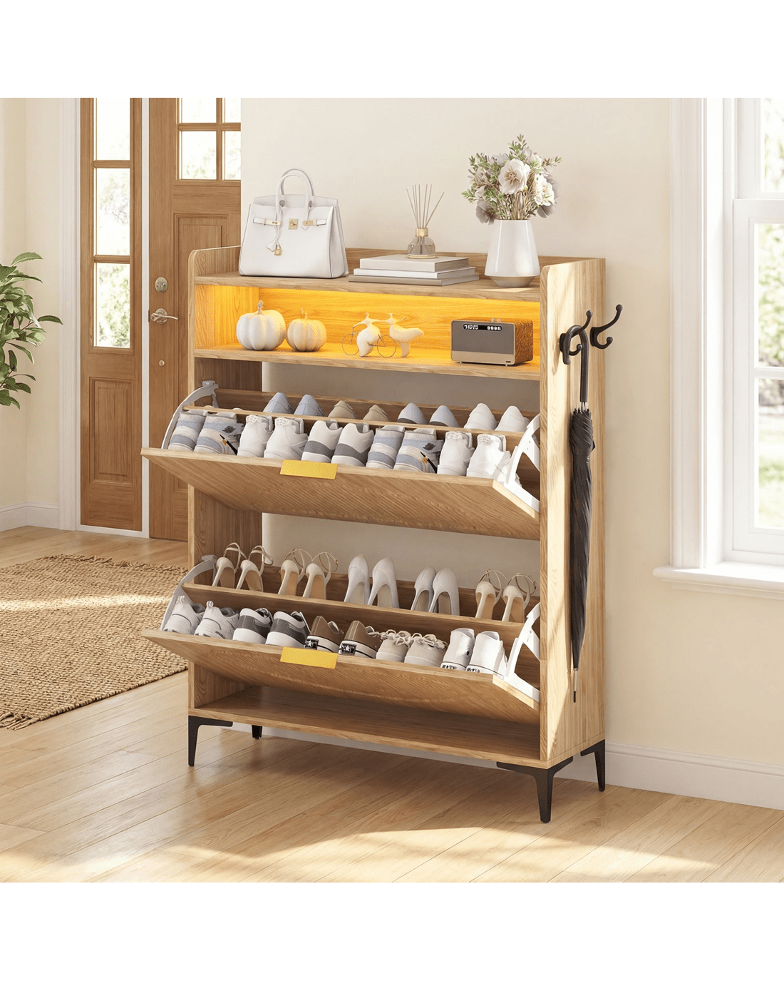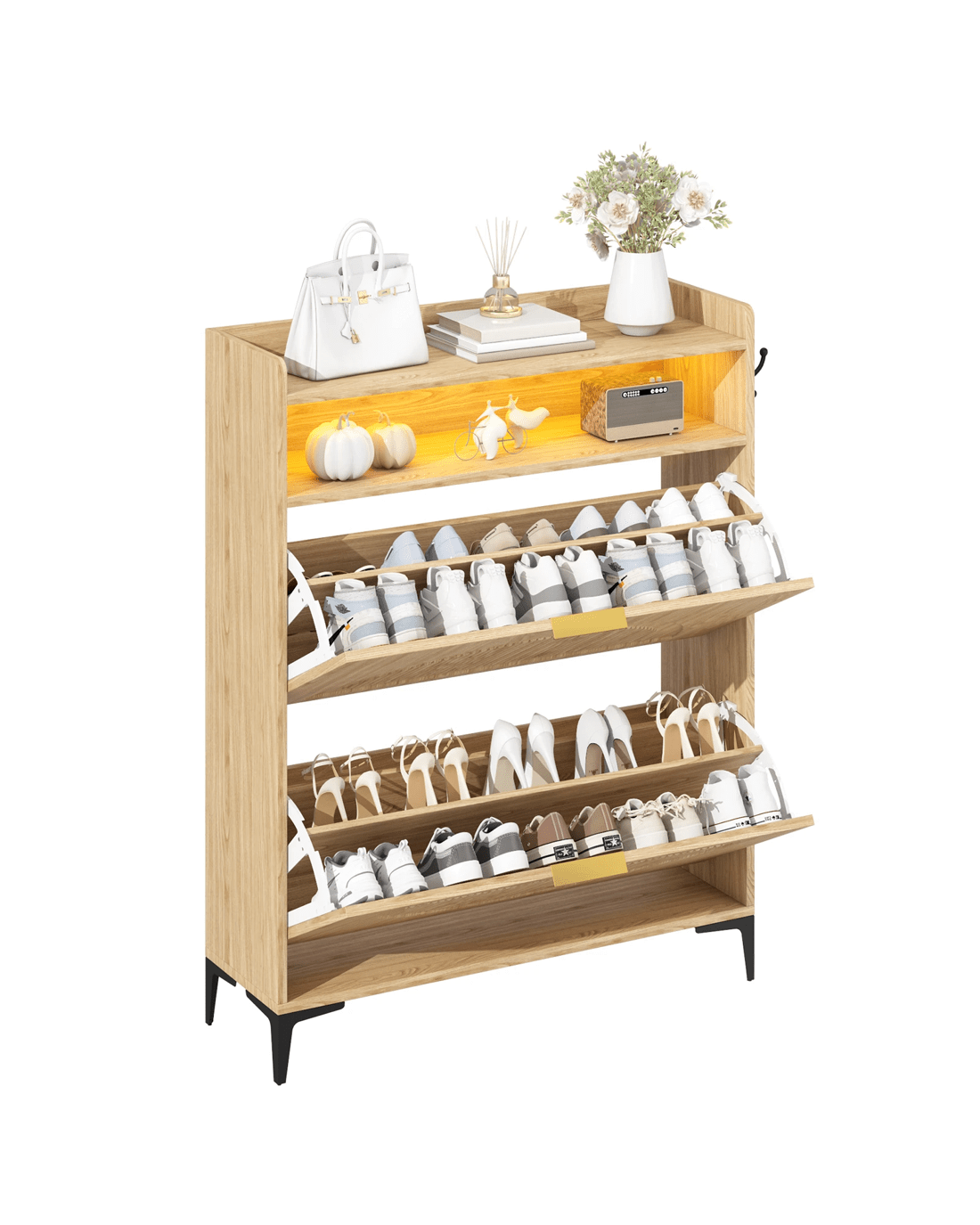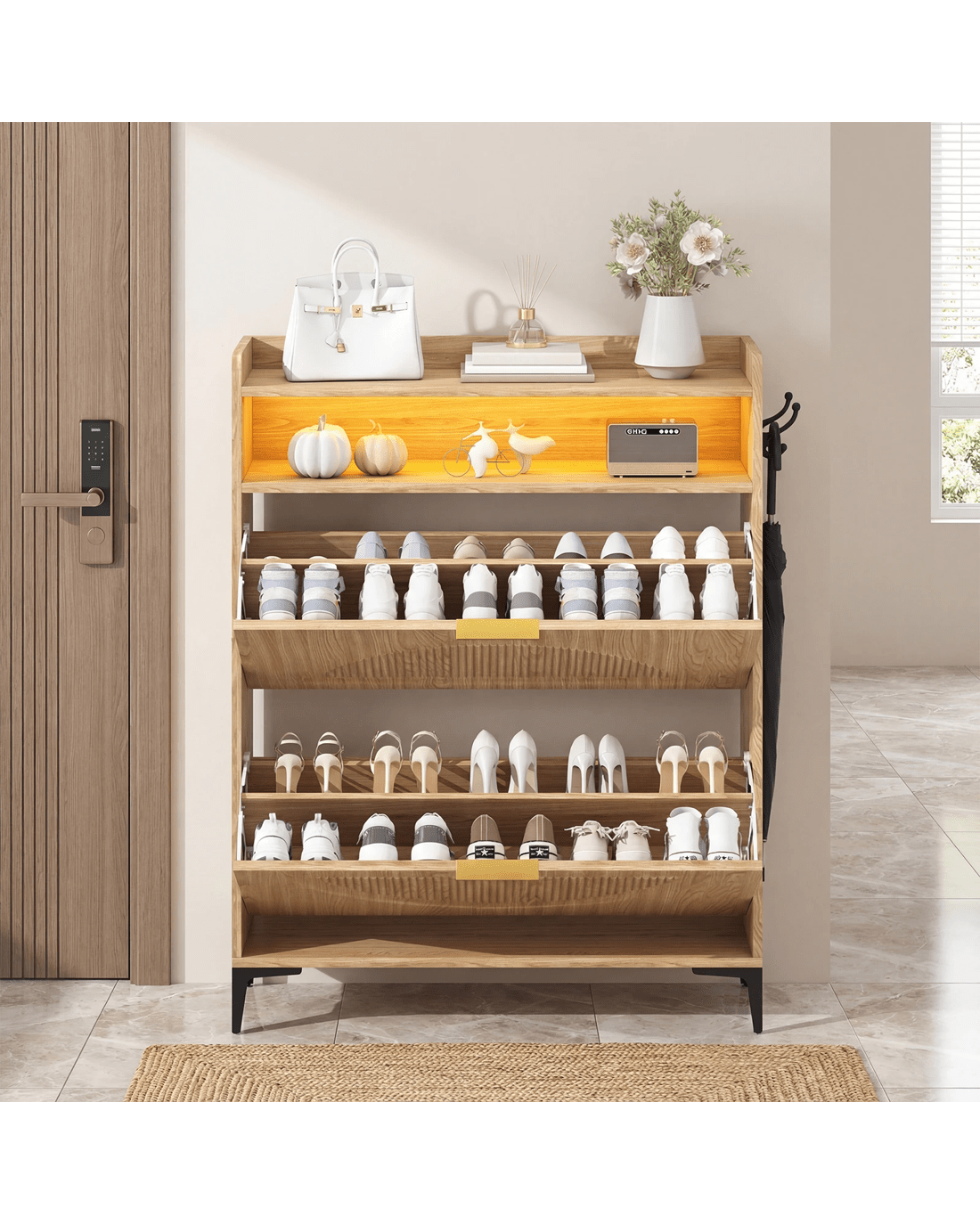 Sold by AdvwinAdvwin LED Shoe Storage Cabinet w/ Flip Drawers and Open Shelf Shoe Organizer Narrow Shoe Rack Cabinet with Hook