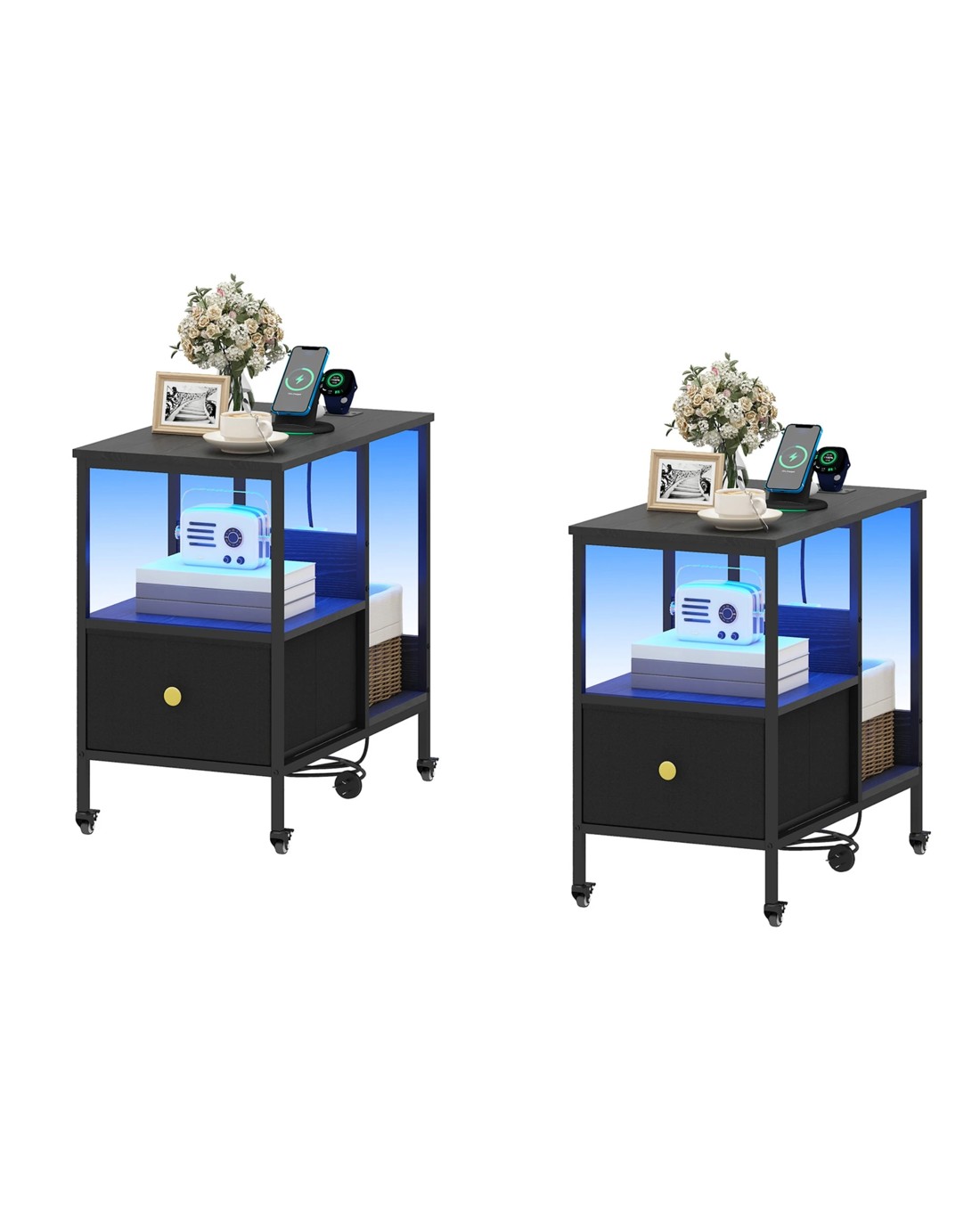 Sold by AdvwinAdvwin LED Side Table Set of 2 Sofa End Table w/ Power Outlets & Wheels Slim Bedside Table w/Reversible Drawer - Black