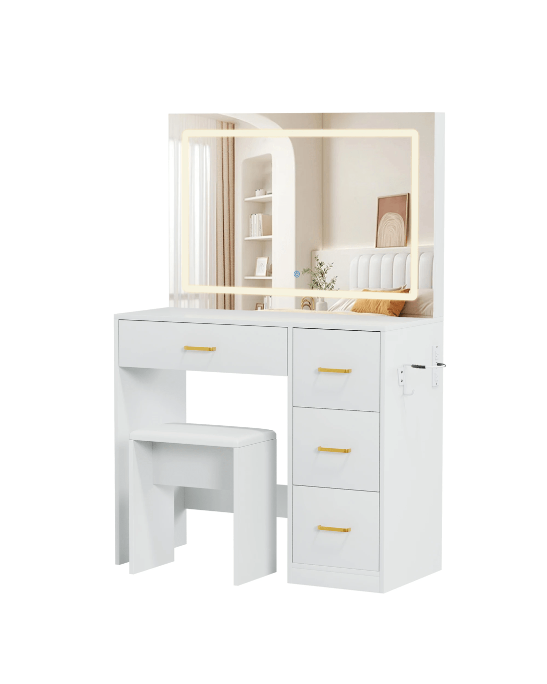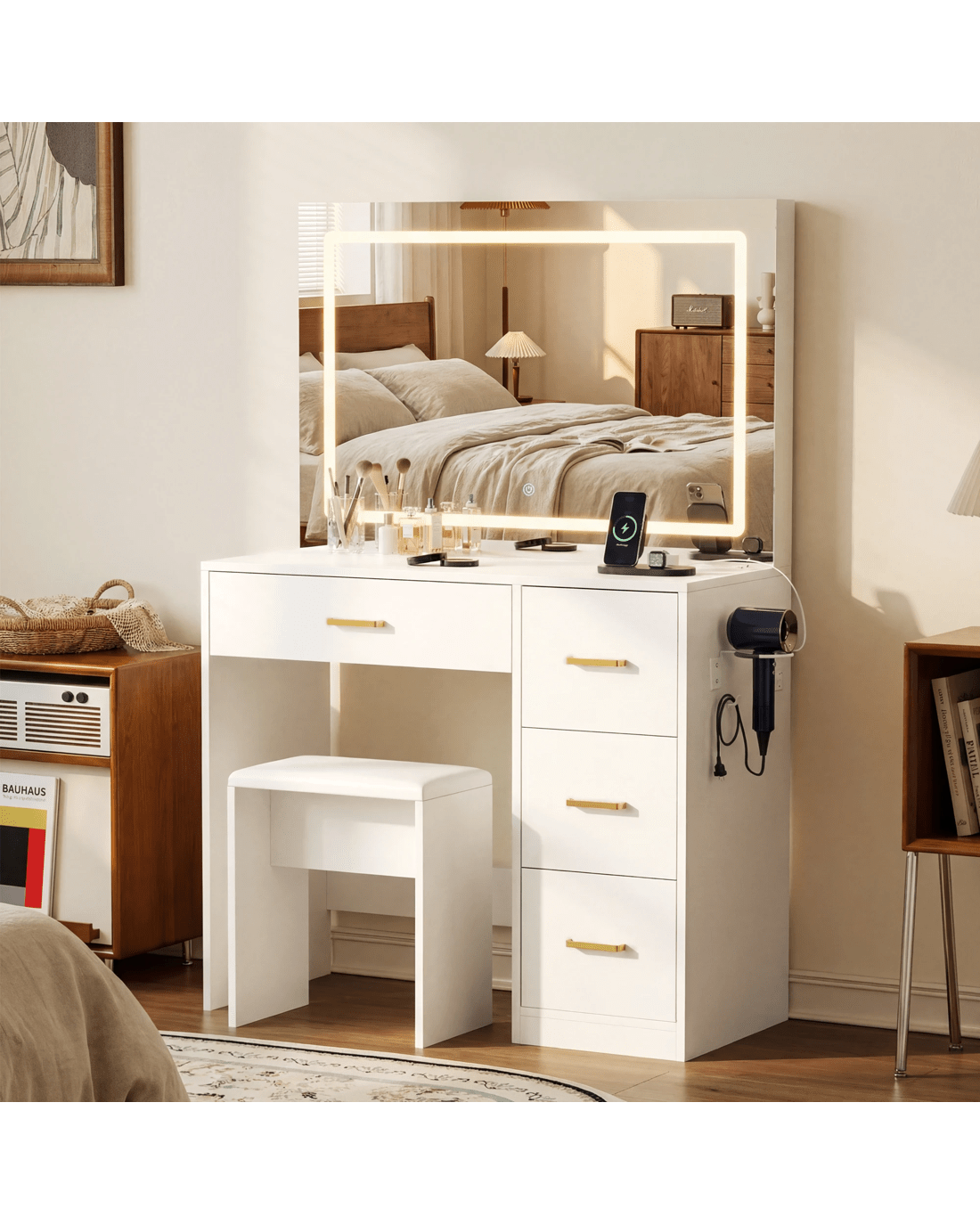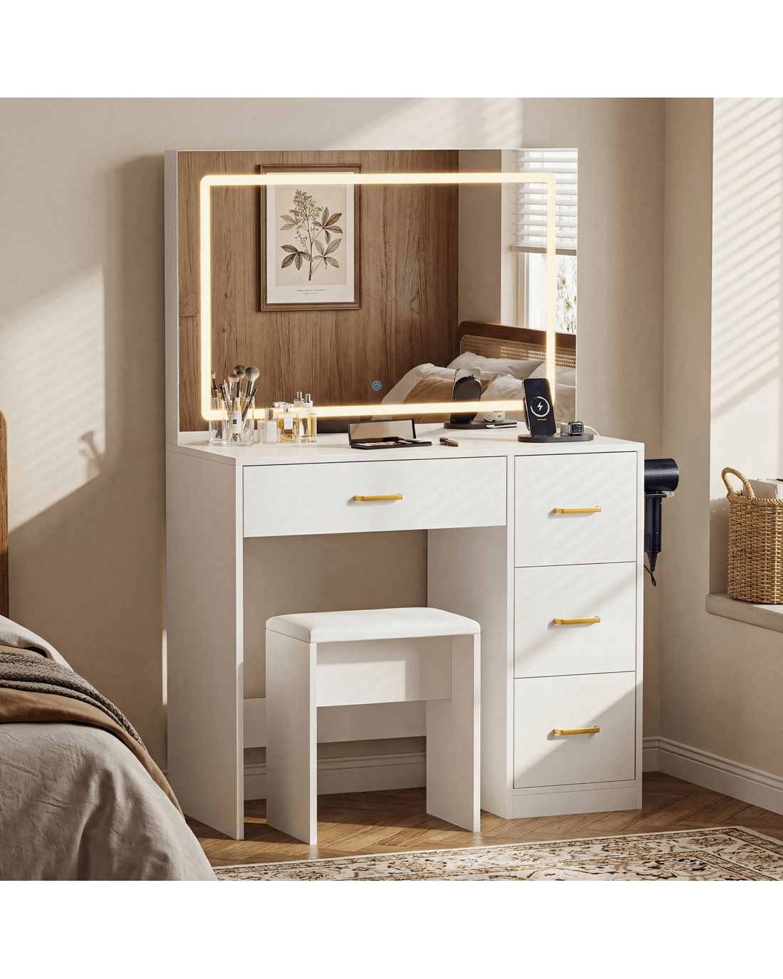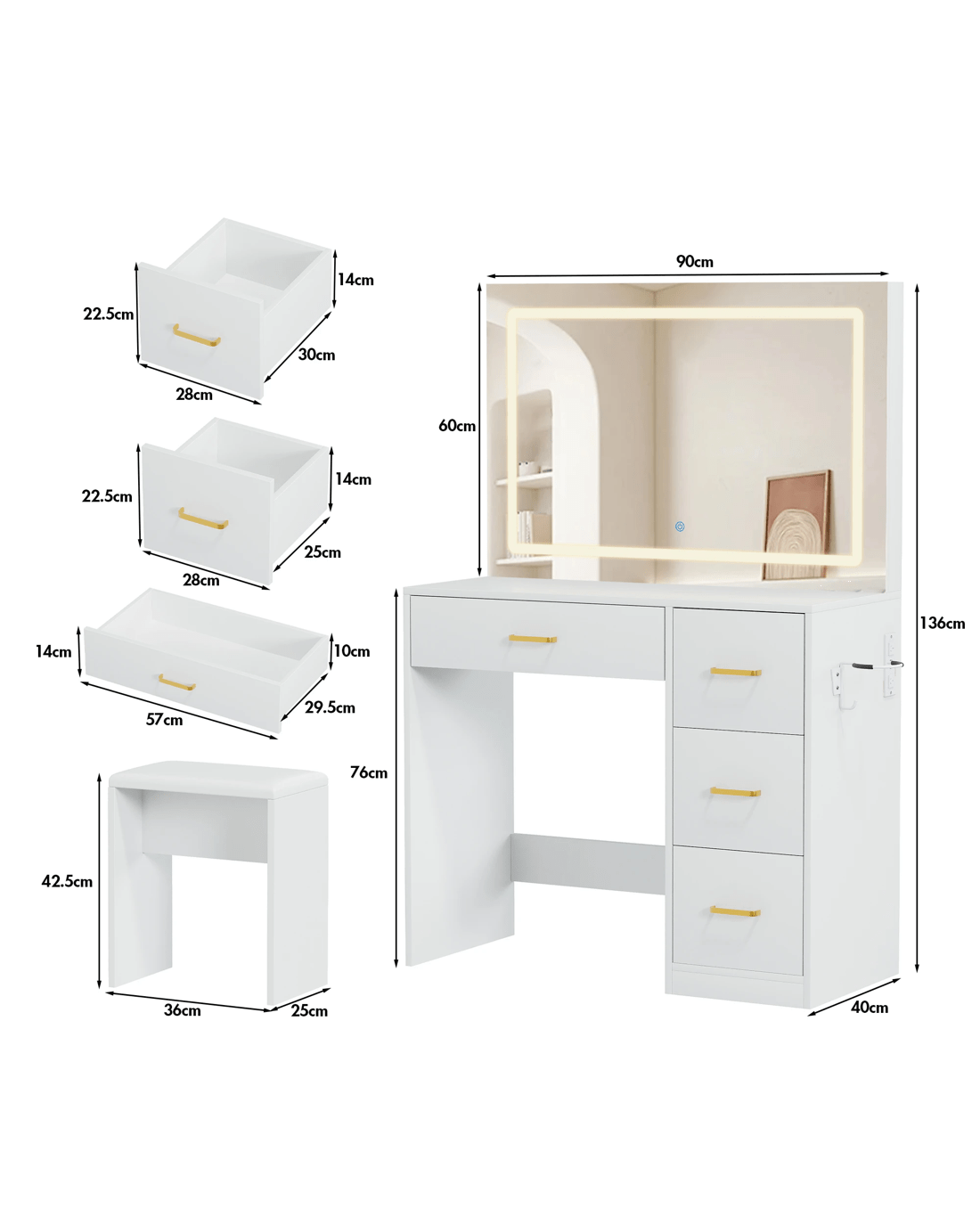 Feature:Wide-Angle Illumination:Featuring full-size design, vanity mirror delivers a wide field of view for flawless makeup application. Equipped with 90x60cm LED mirror, 3 adjustable lighting modes (cool white, warm white, and warm yellow) and brightness adjustment, it allows easy customization through intuitive touch controls for any setting.Charging Station & Hair Dryer Rack:Equipped with 2 AC outlets, 1 USB port and 1 Type-C port, plus a built-in hair dryer rack, this vanity desk easily plug in your hair dryer, curling iron or phone without leaving your seat, providing instant access to essential electronics and styling tools.Ample Storage Space:Designed for both beauty and functionality, the white vanity features 4 spacious drawers that offer refined, categorized storage for makeup, skincare, hair tools and accessories. Everything stays neatly organized and within reach, keeping your tabletop elegant and clutter-free.Stylish & Simple Design:This vanity desk showcases a modern, minimalist design with a white finish and gold handles for a refined touch. Ideal for bedrooms, dressing rooms or beauty studios, it combines style and functionality—making it a thoughtful gift for wives, daughters or friends.Easy to Assemble:Crafted from high-quality particleboard for durability and stability, this vanity set comes with clear, step-by-step instructions. All hardware and components are precisely labeled, allowing for a smooth, straightforward assembly process.Specifications:Color: WhiteMaterial: E1 ParticleboardMirror: HD MirrorLight: 3-Color Adjustable LED BulbsNumber of Drawers: 4Australian Standard Plug: 2 AC Outlets, 1 USB Port & 1 Type-C PortOverall Dimension: 90×40×136cm (L x W x H)Stool Dimension: 39.5×25.5×42.5cm (L x W x H)Mirror Dimension: 90×60cmAssembly Required: YesNumber Of Packages: 2Package Content:1×Dressing Table Stool Set1×Assembly InstructionsNote: Shipped in 2 boxes, which may arrive on different days. No worries!WARNING:Children have died from furniture toppling over.