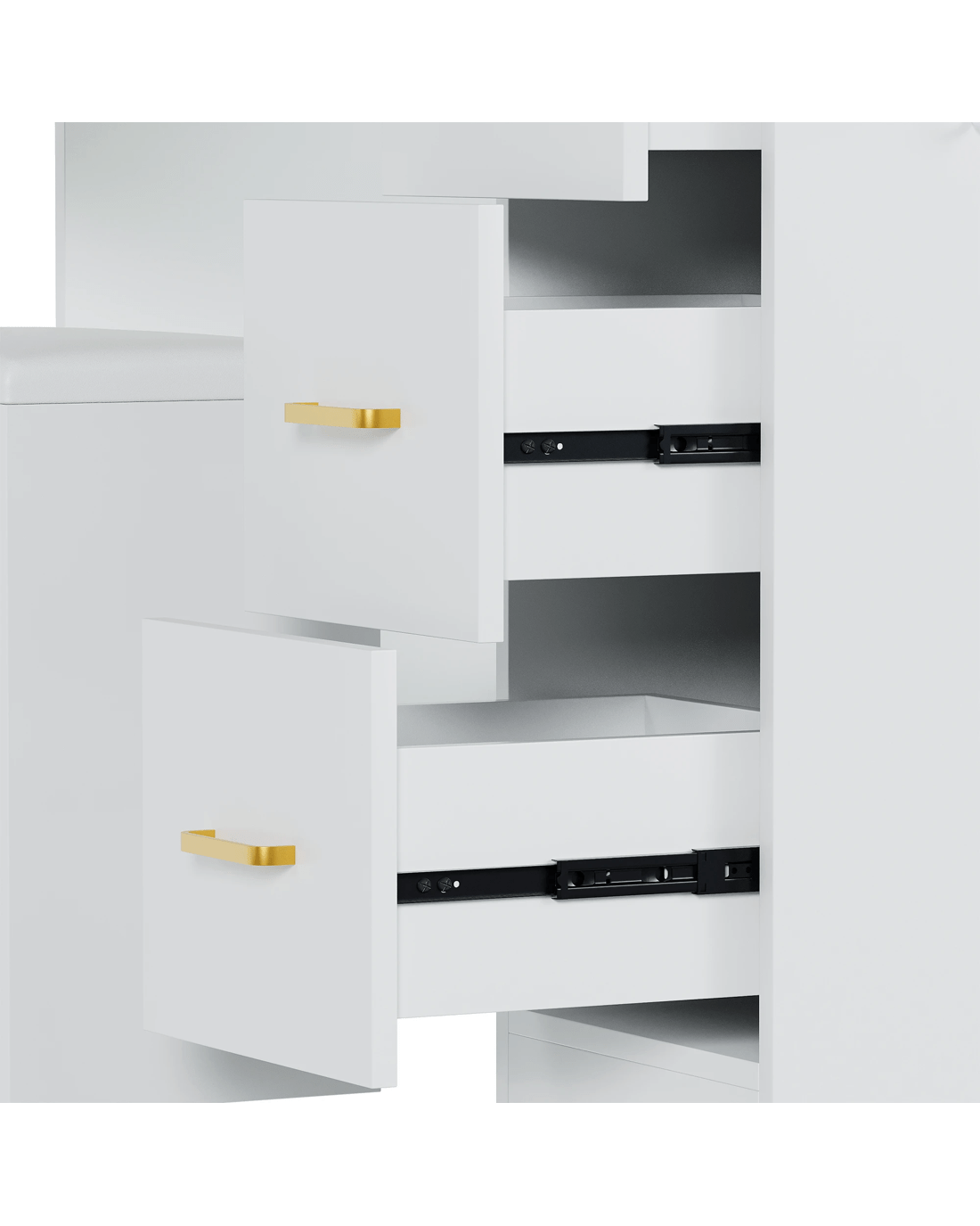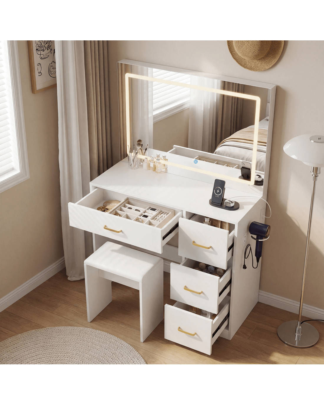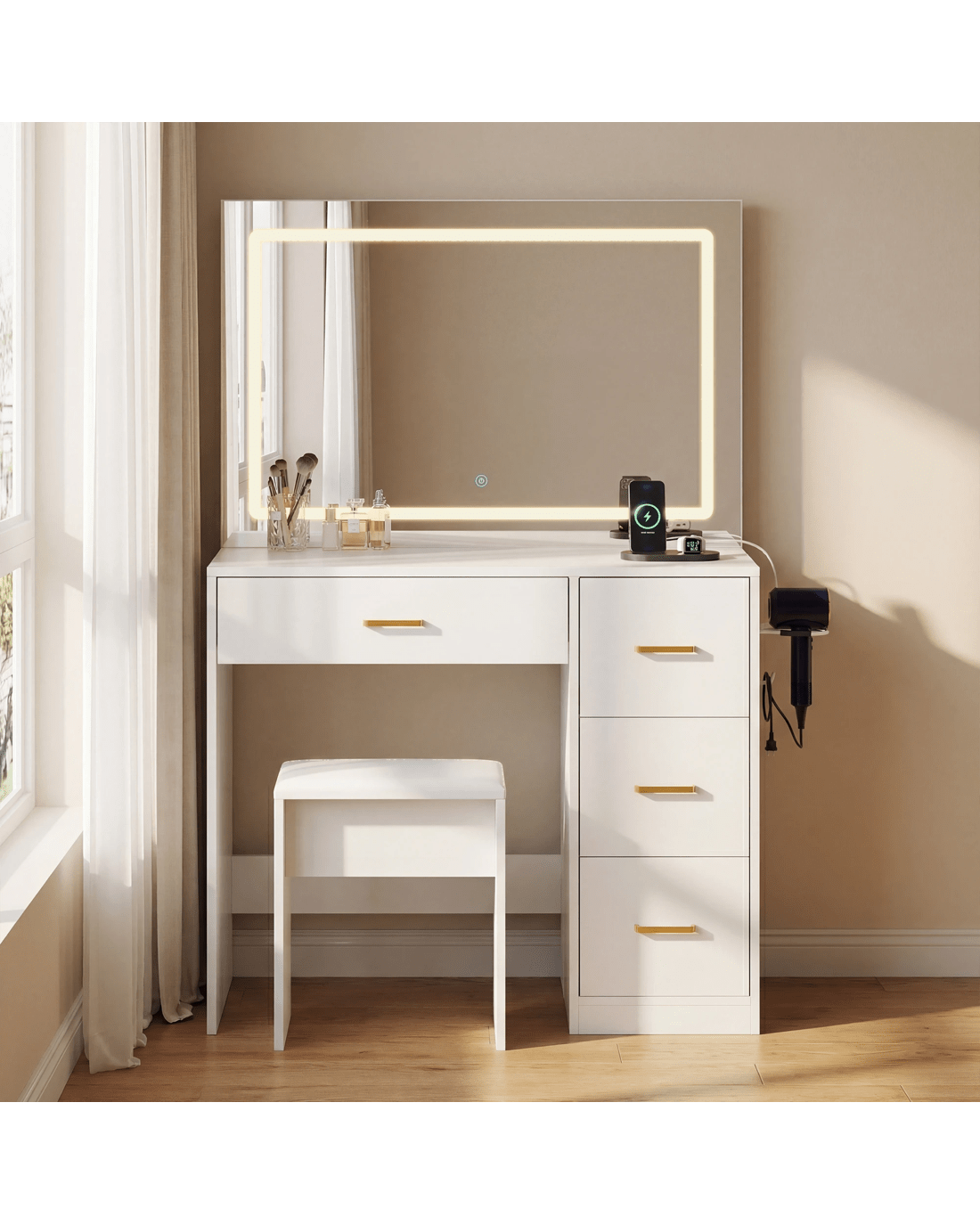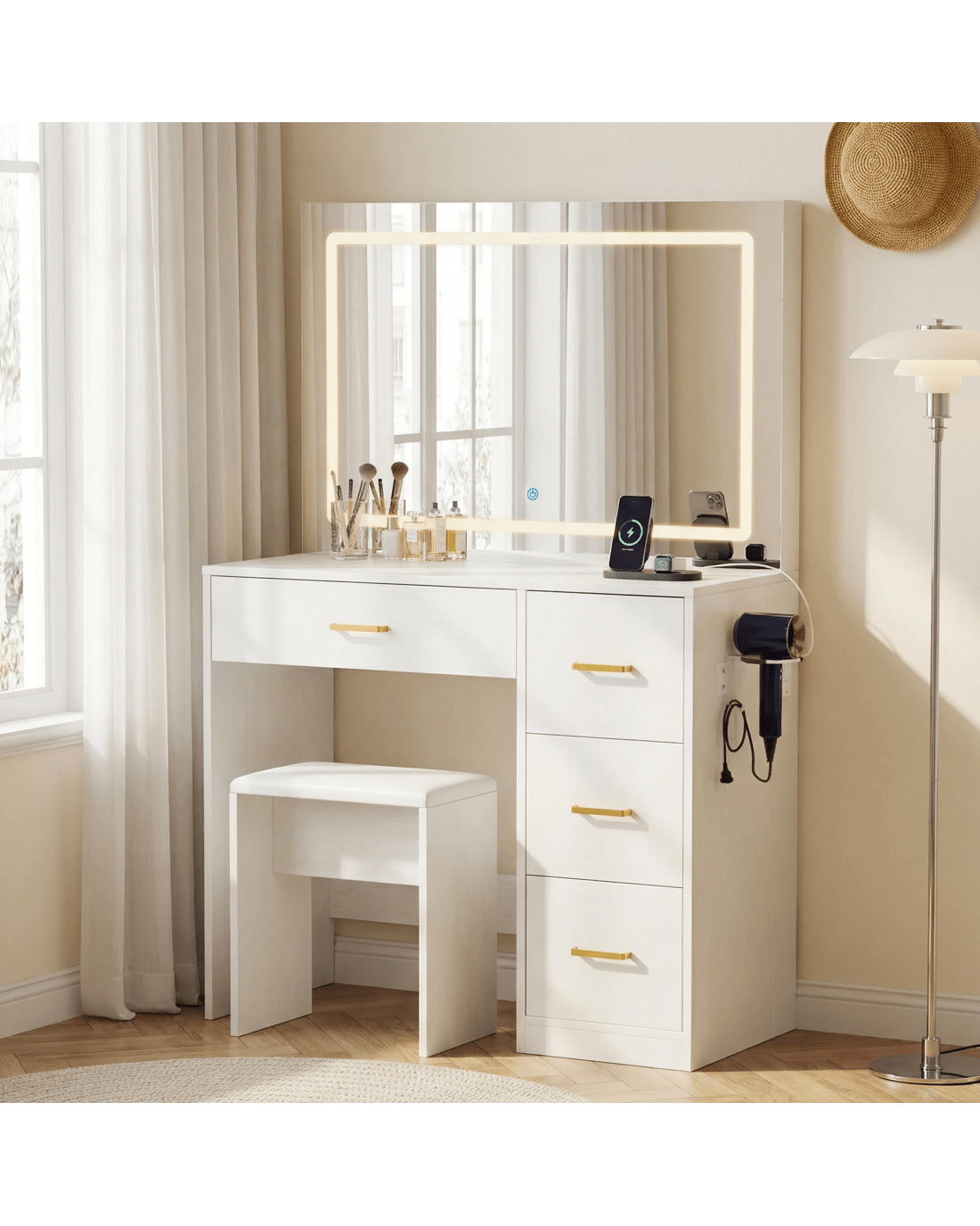 The vanity desk with full-size LED mirror delivers wide-angle illumination and three adjustable lighting modes—cool white, warm white and warm yellow—easily controlled by touch to suit any makeup setting. A built-in charging station with 2 AC outlets, 1 USB port and 1 Type-C port, along with a hair dryer rack, keeps styling tools and devices powered and within reach. Four spacious drawers provide refined, categorized storage for makeup, skincare and accessories, maintaining a clean, clutter-free tabletop. Finished with gold handles, this modern vanity makes a thoughtful gift for wives, daughters or friends.