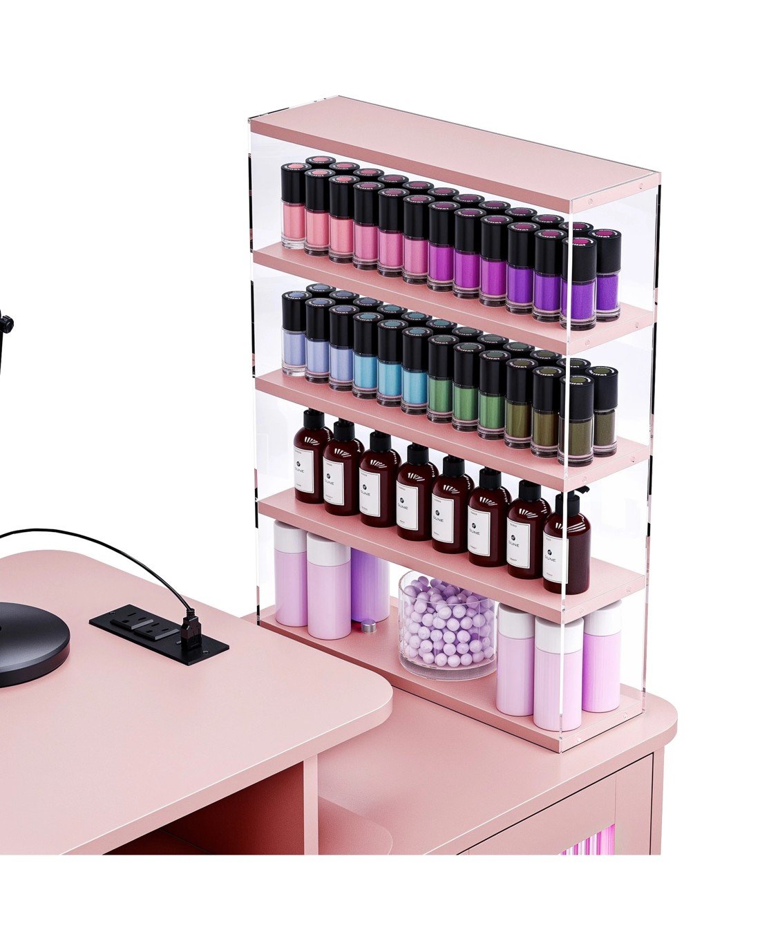 【Versatile and Flexible Storage Options】Features include an open shelf for UV nail lamps, a vertical pull-out drawer for easy access to polish, and a 4-layer acrylic storage racks. The acrylic rack can be securely fixed to the cabinet and also easily moved to the metal support frame, providing you with the flexibility to customize your storage arrangement.