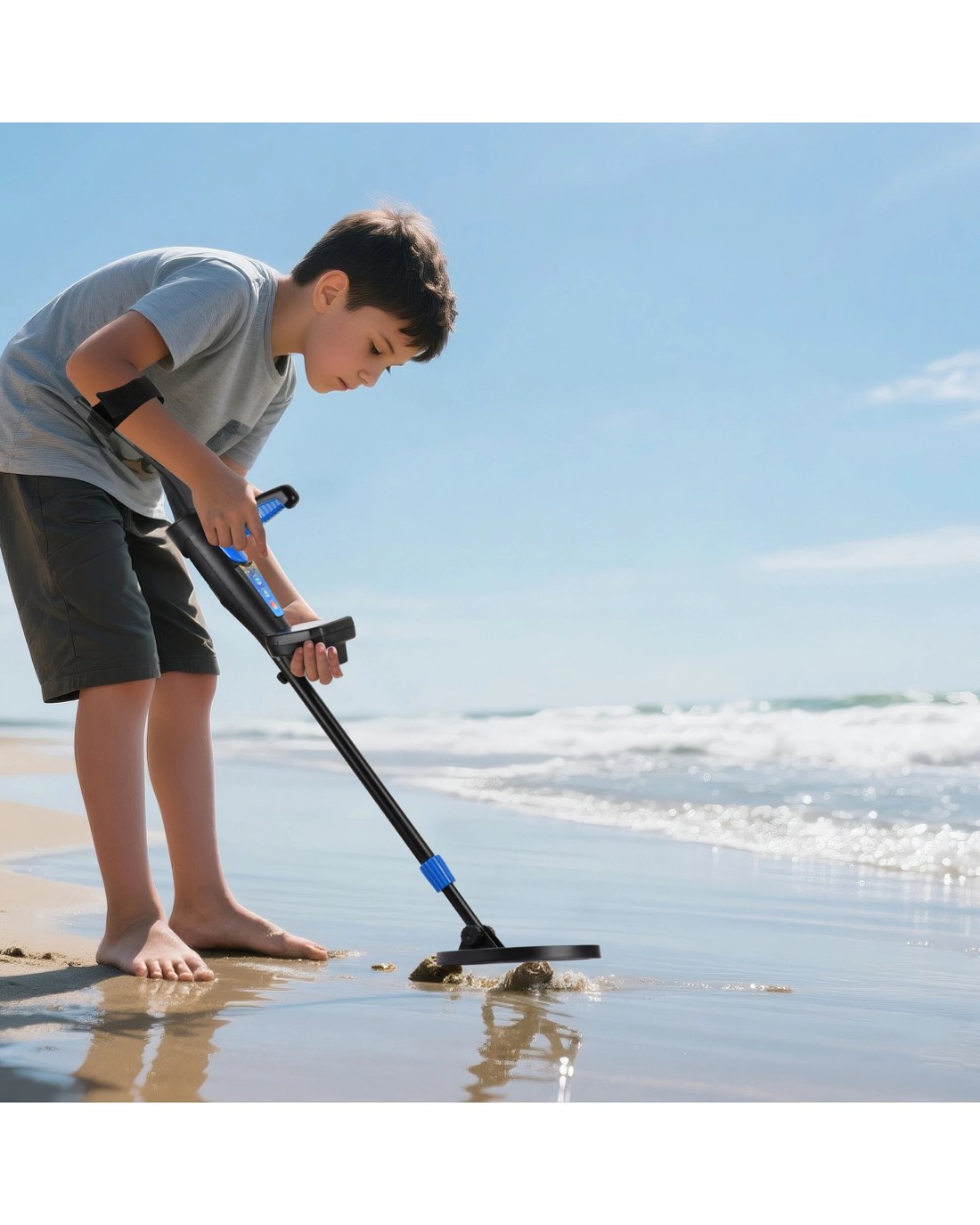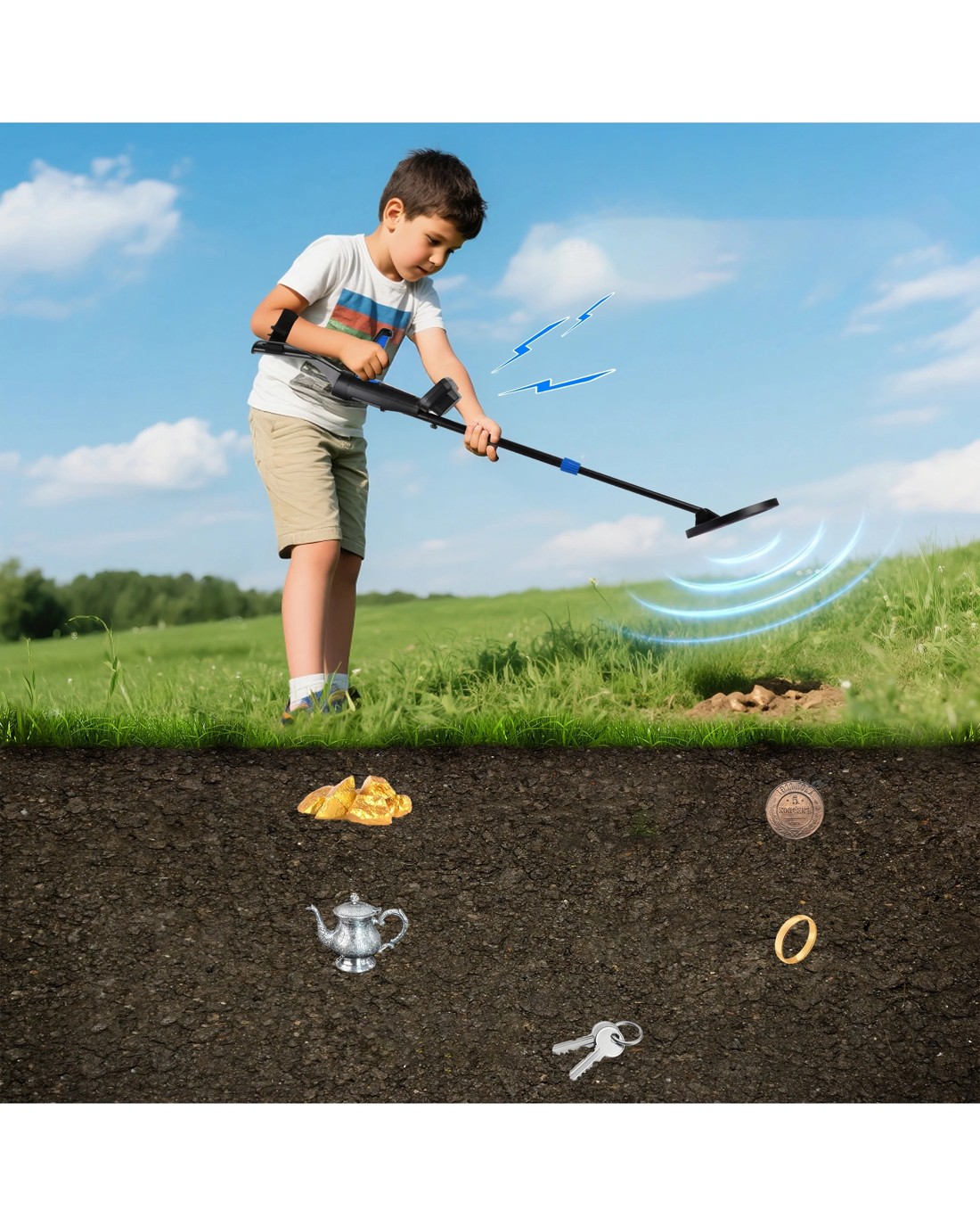 Waterproof Search Coil: The children's metal detector is equipped with a 20cm strong coil and advanced intelligent chip, which can detect underground metal up to 12cm deep. It has precise sensitivity. You can explore beaches, sandy beaches, and streams, and also discover treasures buried underwater. Attention: The control box is not waterproof.