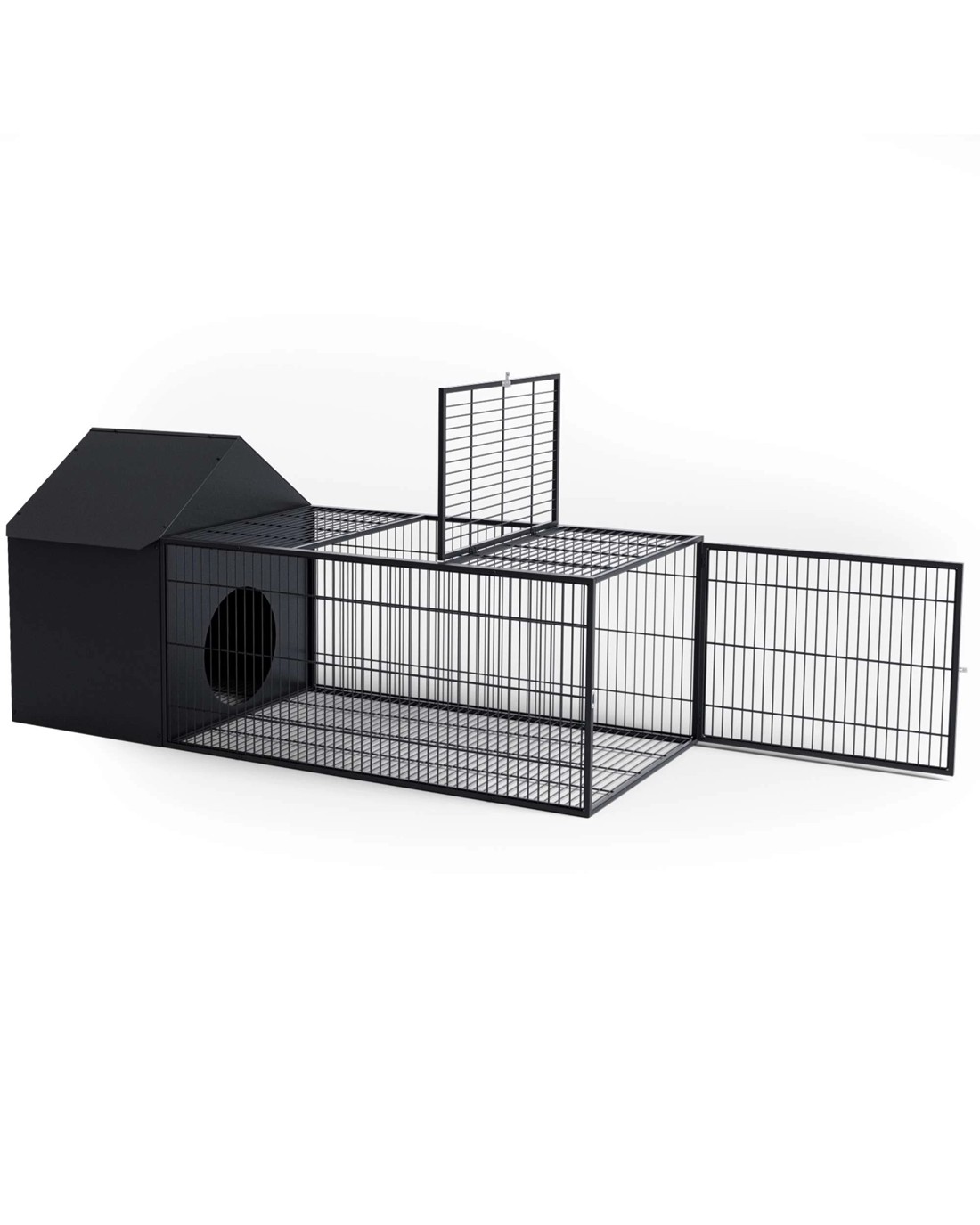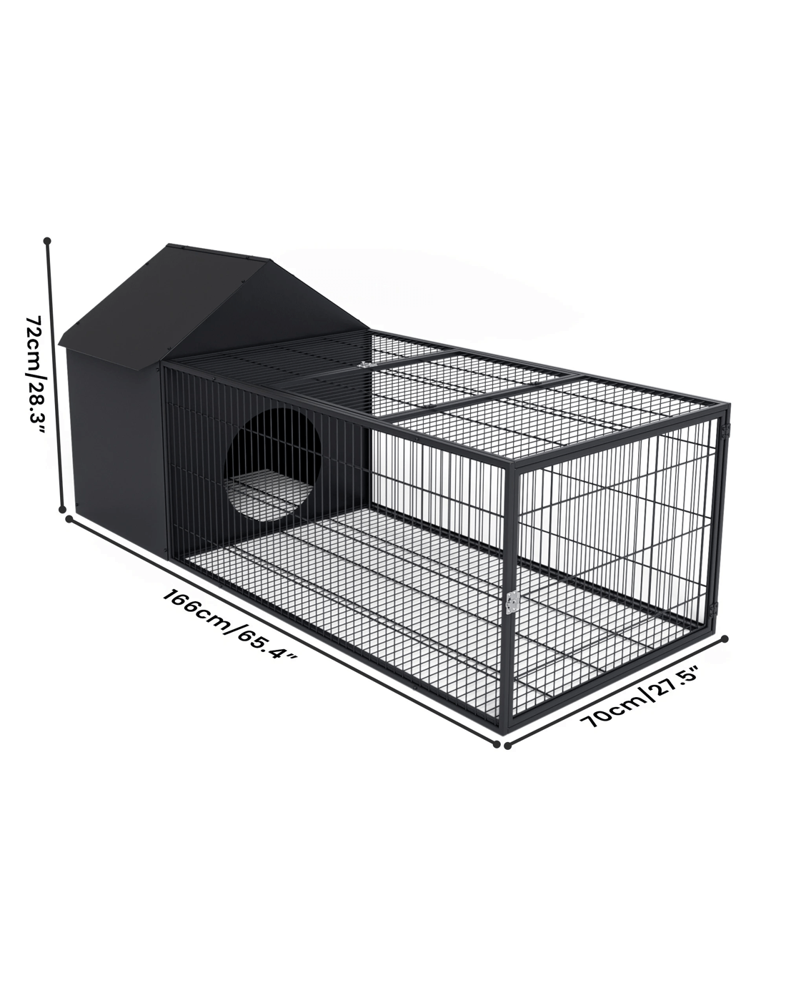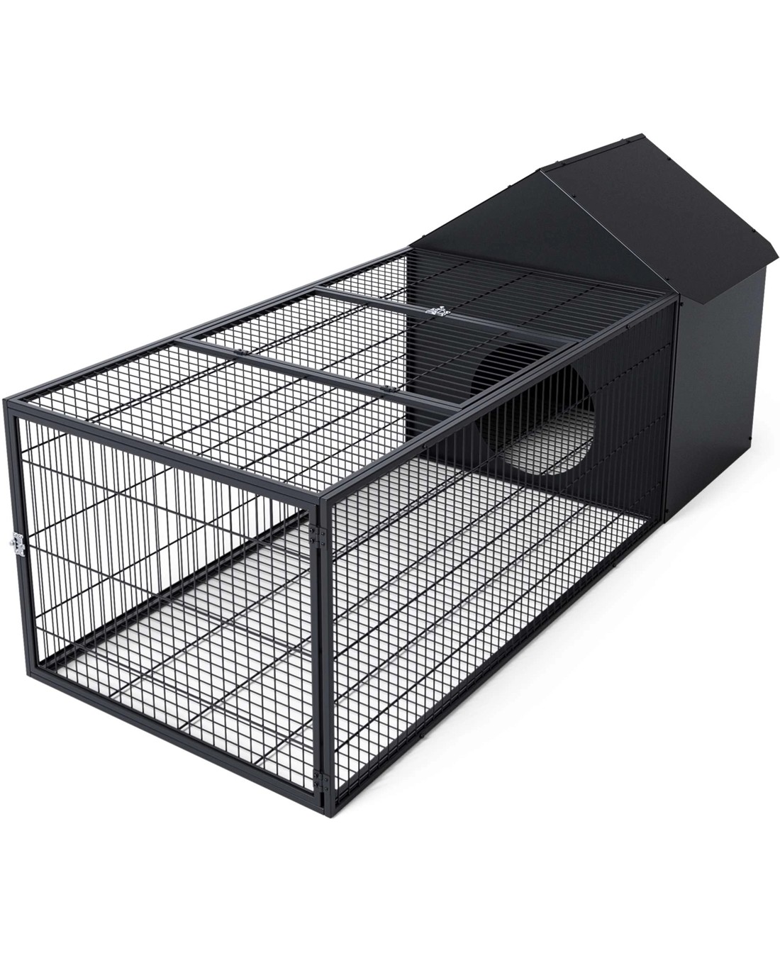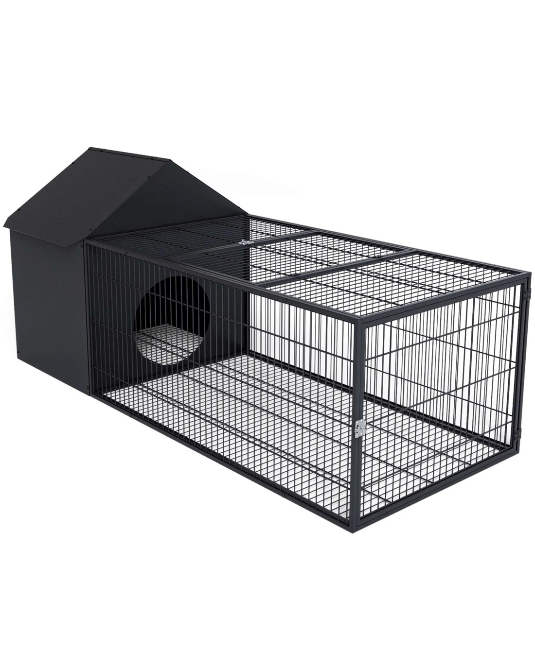 area connected to a spacious, well-ventilated metal run. The durable, chew-proof and weather-resistant metal construction ensures long-lasting protection, while the convenient slide-out tray and dual lockable doors make daily care and interaction
