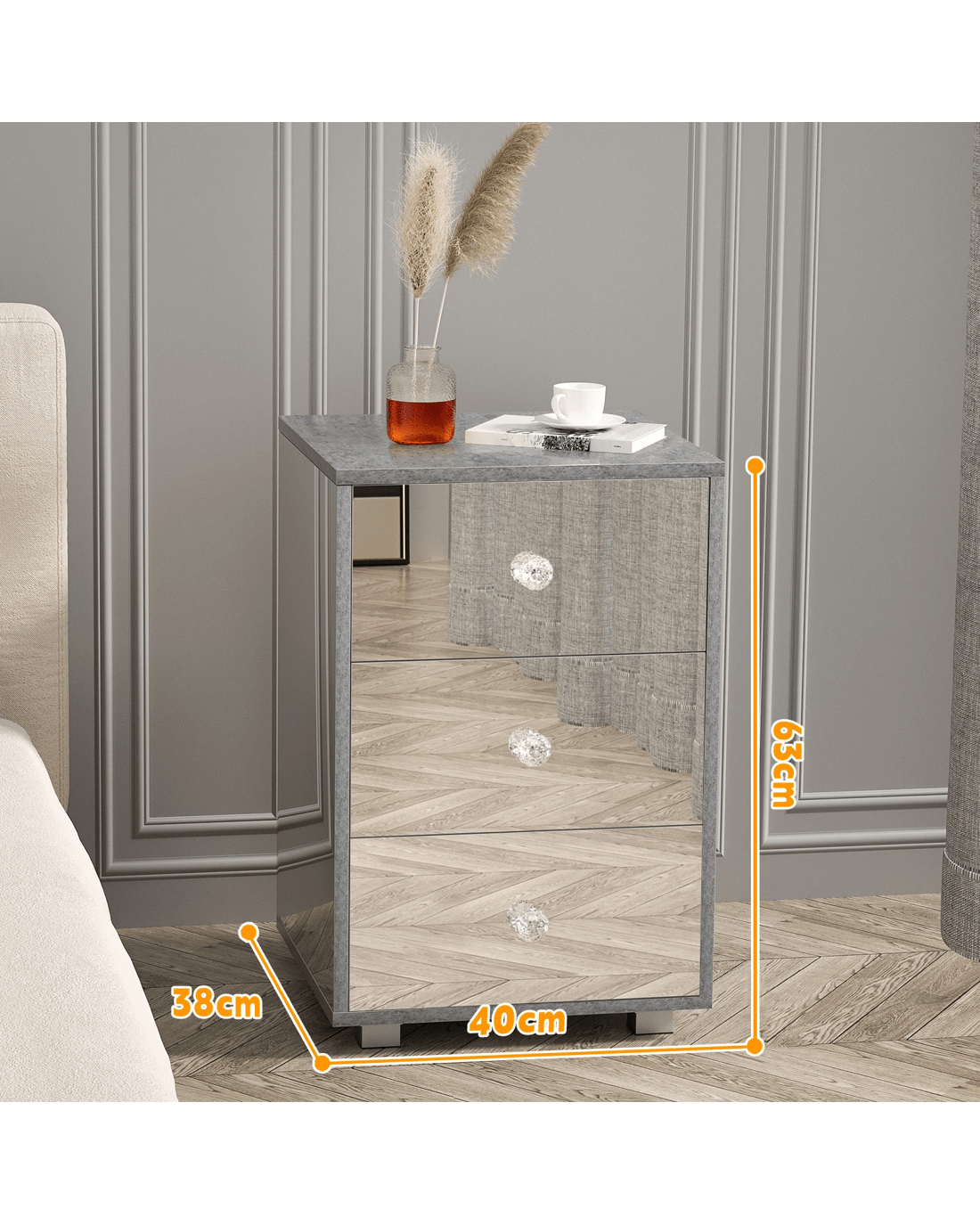 This bedside table is crafted from smooth PET mirror and high quality E1 grade MDF board. The flat top surface and 3 drawers with crystal handles provide convenience of being able to hold small lamps, alarm clock/s book and other items that may be needed at any time.