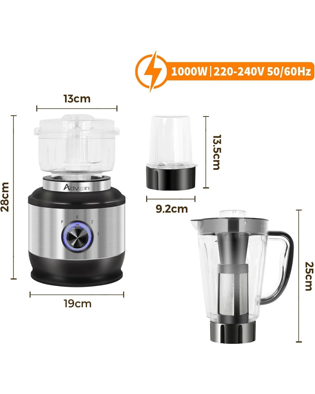 The Advwin 4 in 1 blender is prepared by people who love cooking but hate switching back and forth in multiple appliances. Save storage space and money for you. Grind, stir, filter and mince meat with one device. The three speed settings also provide a perfect solution for each task. The 2L drop resistant large cup has the characteristics of impact resistance, heat resistance, stain resistance and scratch resistance. Mixer can have so many advantages at the same time. This is the equipment you really want!