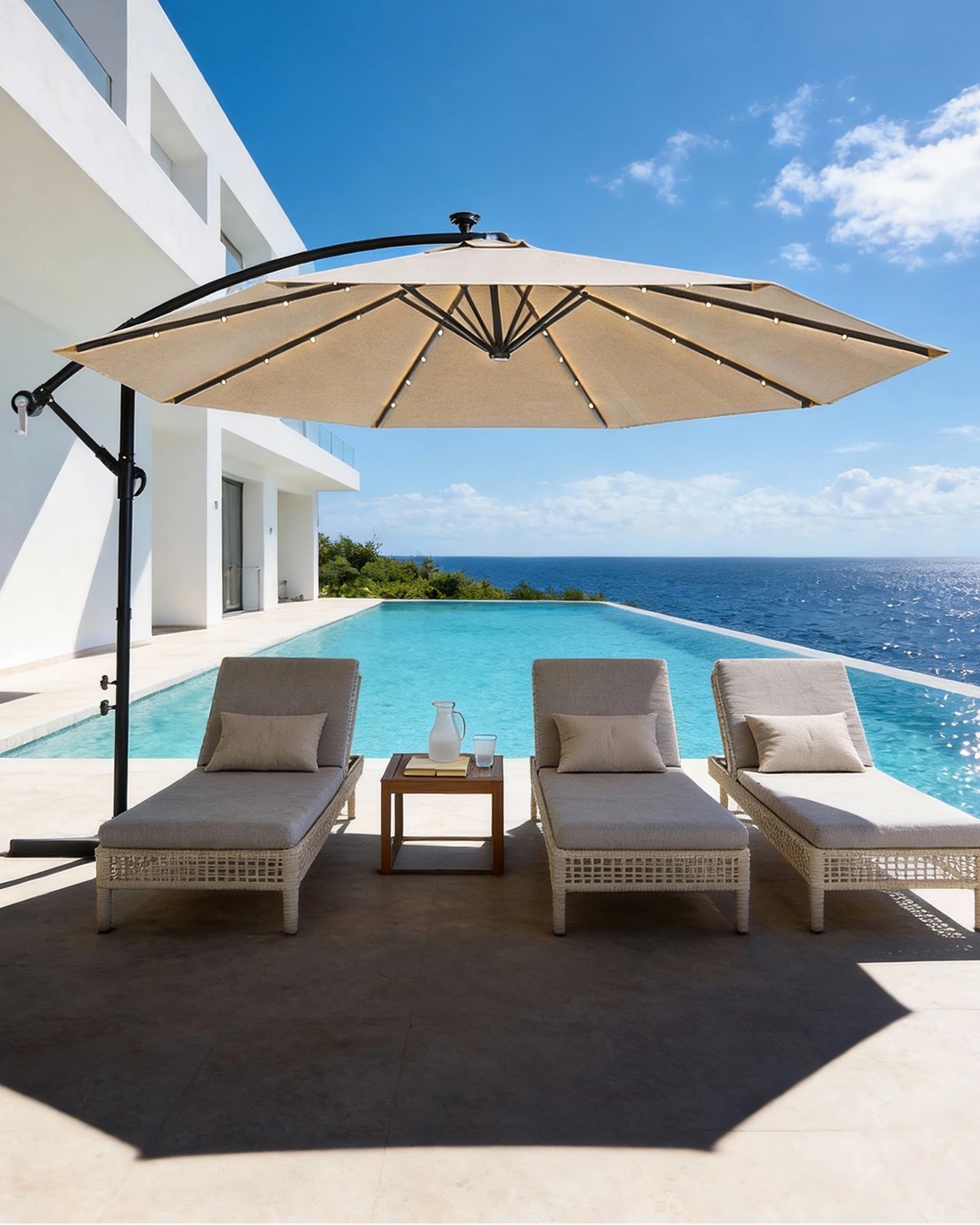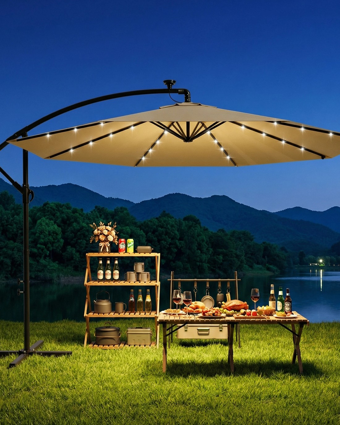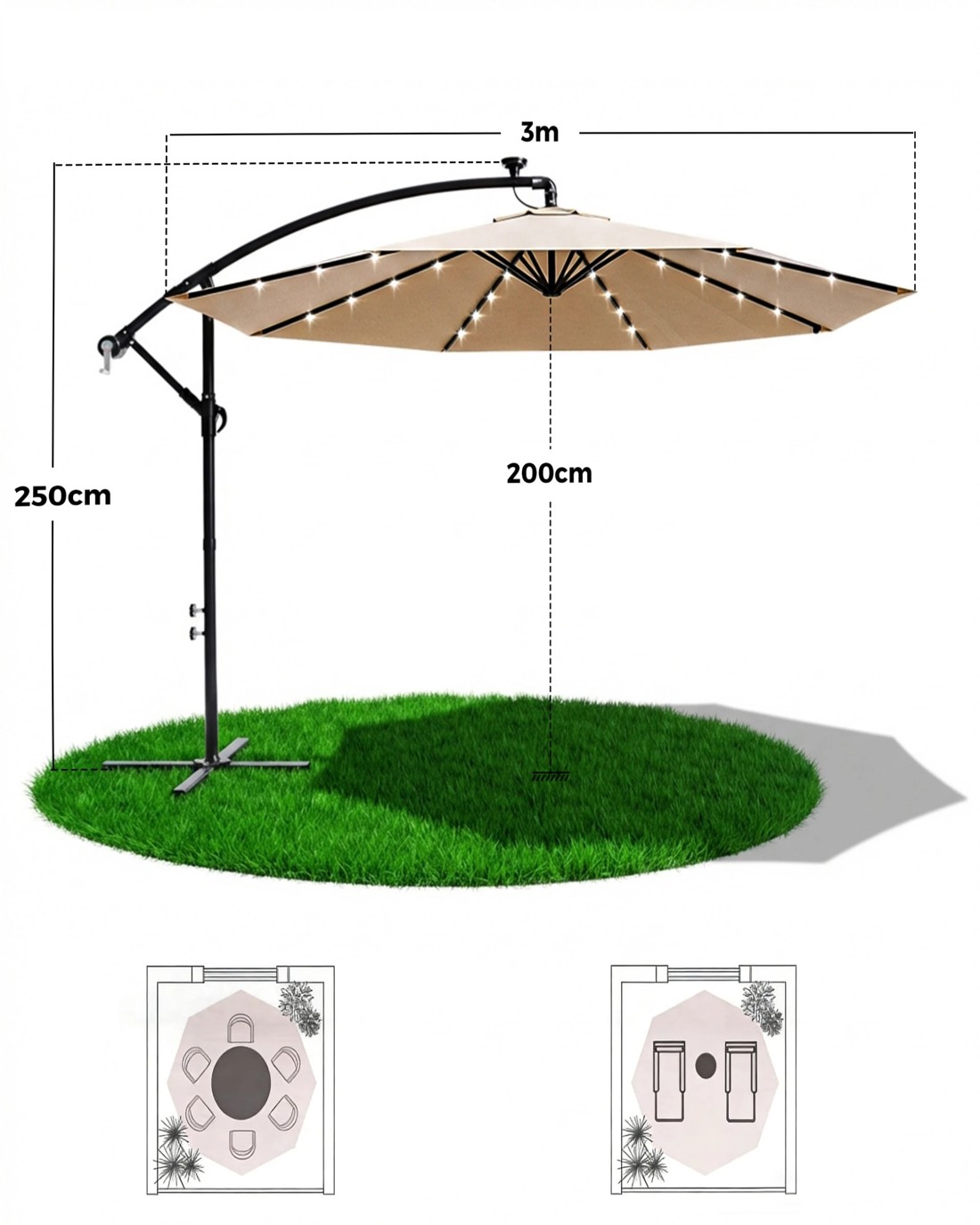 Our 3m solar patio umbrella - creates a spacious, shaded haven for every outdoor occasion. Whether you're unwinding with family on the backyard patio, hosting lively BBQs in the garden, lounging by the pool, or setting up a cozy spot at the beach, this hanging cantilever umbrella delivers reliable sun protection and ambient lighting.