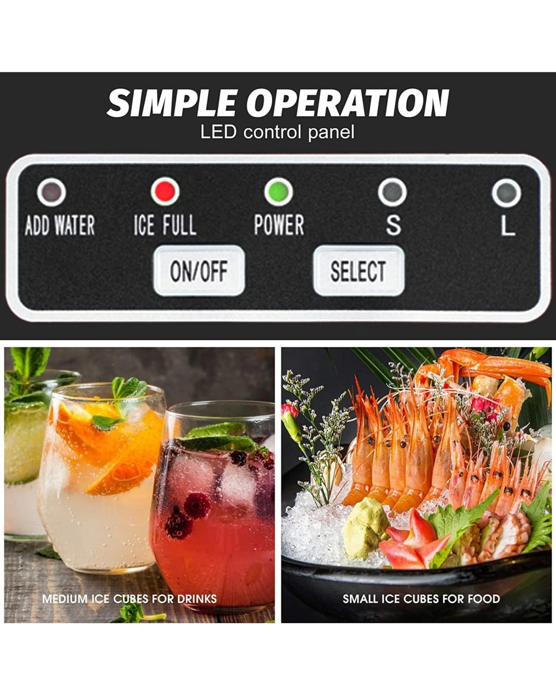 One-touch operation: Add an apporiate amount of water, just turn on the power, press the switch, select the ice cube size(S or L) and start the ice making.
