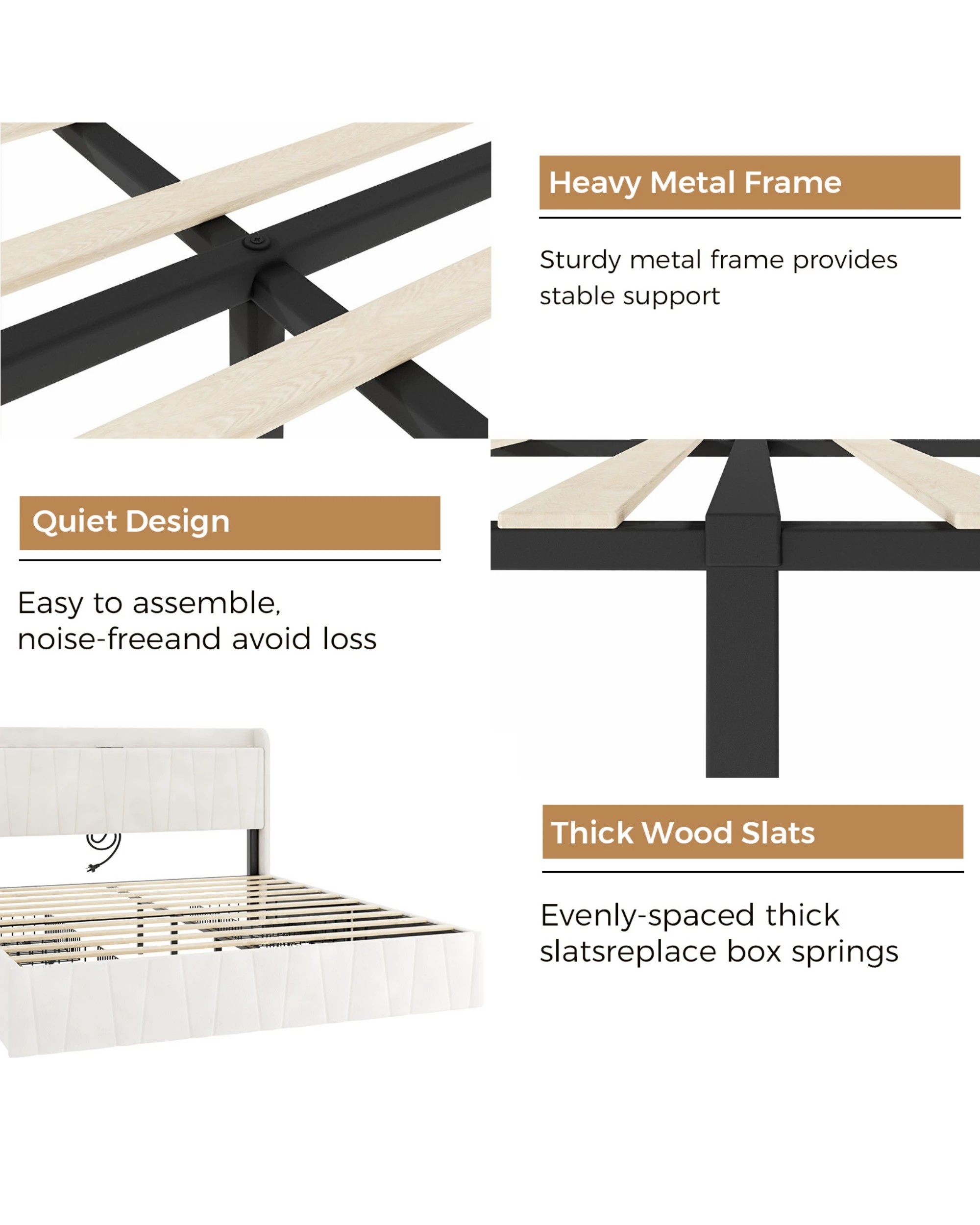 Advwin Queen Bed Frame With 4 Storage Drawers & Charging Station Biege