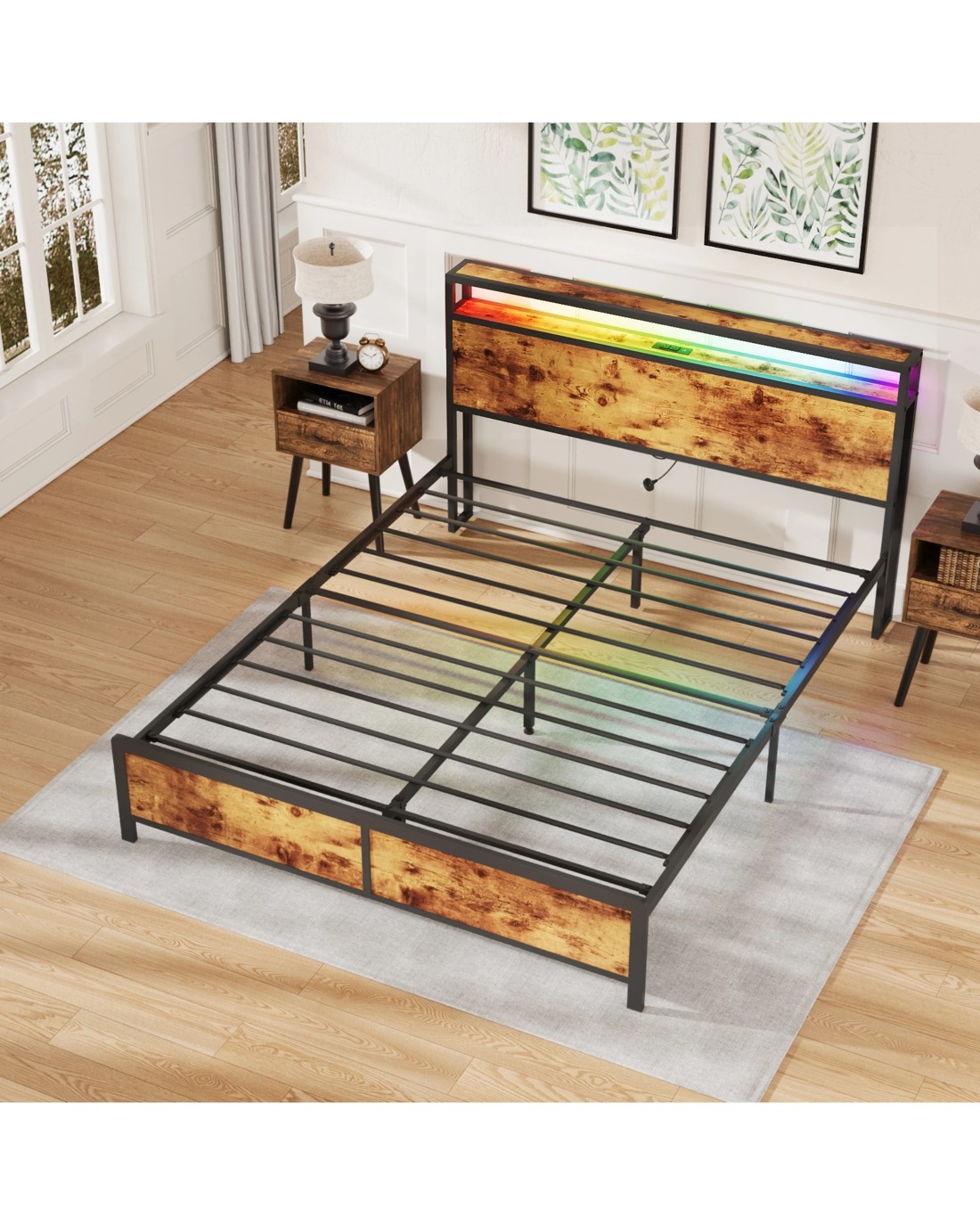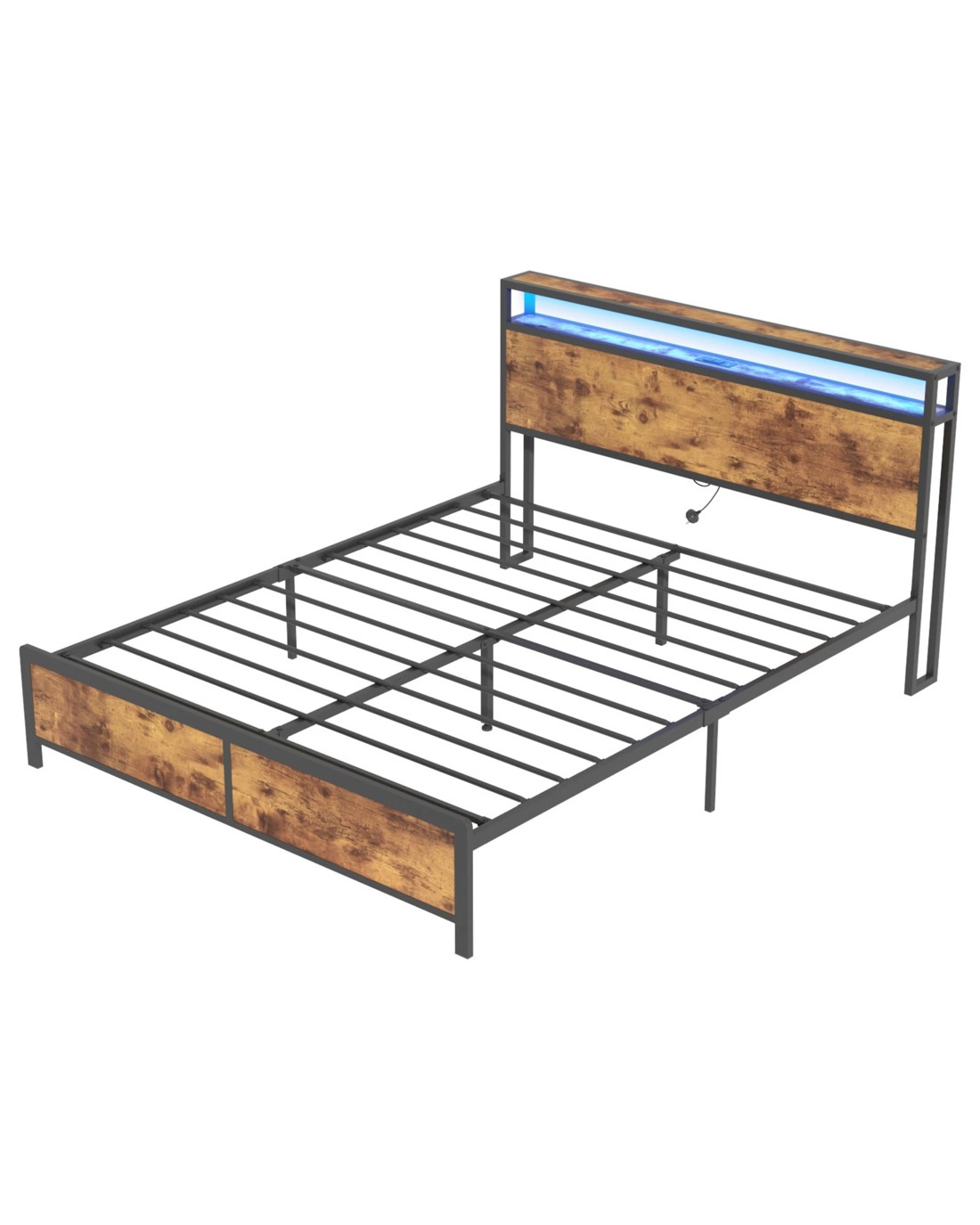 Featuring a modern industrial design, this bed frame adds a touch of contemporary charm to any room. The wooden headboard provides a comfortable and cozy space to rest your head. With built-in storage and display space on the headboard, you can conveniently store and showcase your favorite items. The metal bed frame is equipped with 2 power outlets and 1 USB & 1 Type C ports, allowing you to easily charge your devices without the need for extra adapters. Create the perfect ambiance with the multicolor LED light strip. With 16 different colors, adjustable brightness, and customizable lighting modes, you can set the mood for relaxation and enjoyment. The LED light strip can even sync to music, adding an immersive experience to your bedroom.