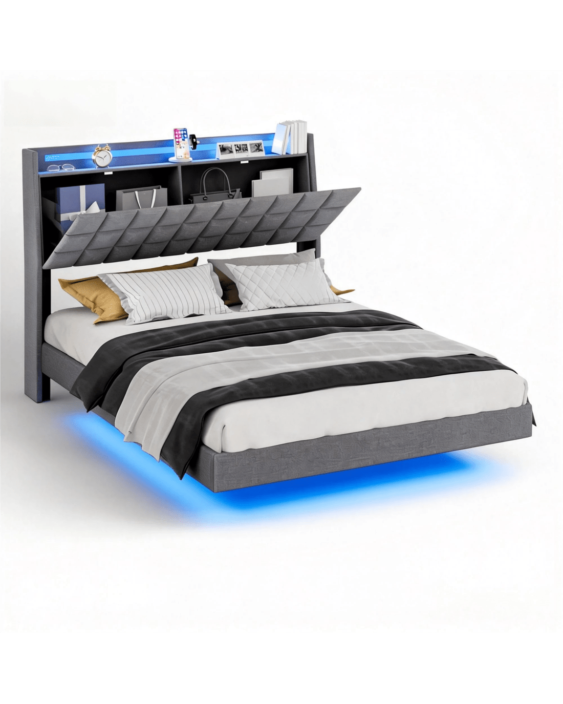 Sold by AdvwinAdvwin Queen Size Floating Bed Frame with Led Lights and Storage Headboard Dark Grey
