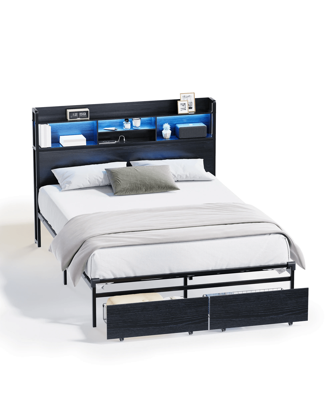 Sold by AdvwinAdvwin Queen Size Bed Frame with 2 Drawers Led Light & Charging Station Black