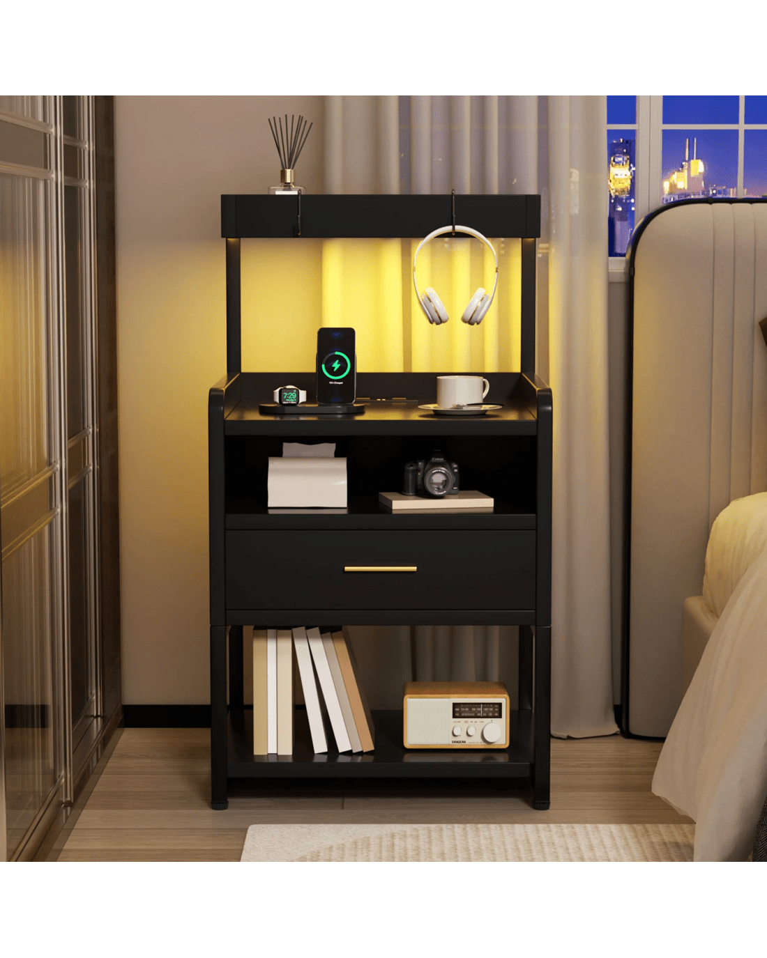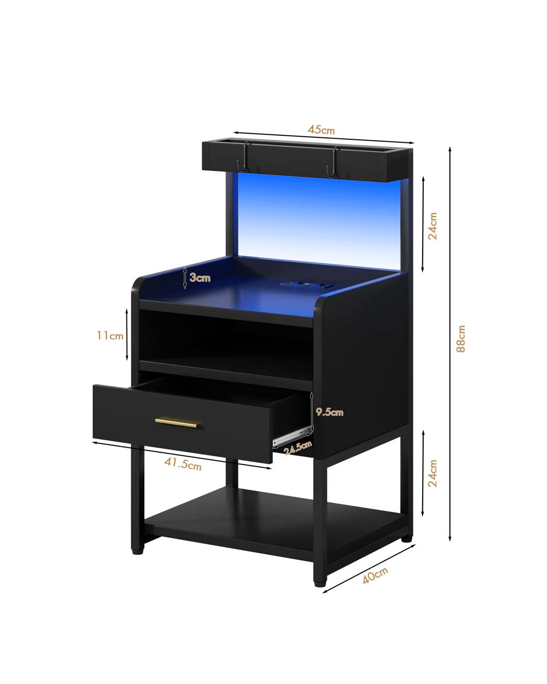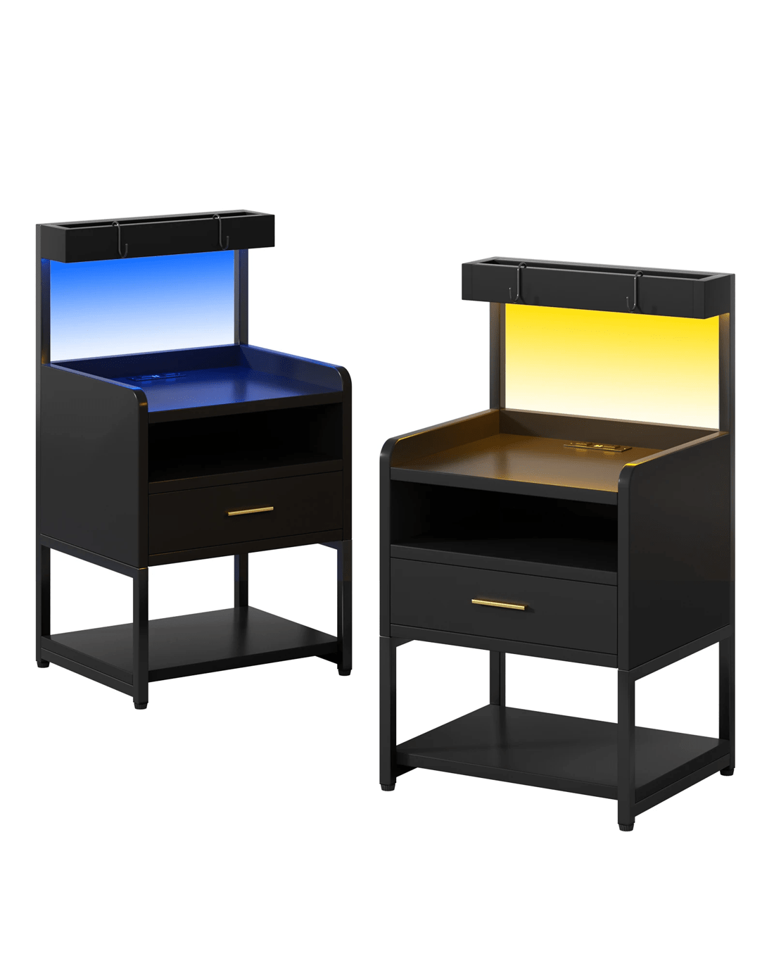 The Advwin Bedside Table is a modern and functional addition to your home. This nightstand features a multi-color RGB LED backlight with adjustable brightness and a built-in mic that syncs with music, creating a dynamic and stylish ambiance. Equipped with 2 AC outlets and 2 USB ports, it provides convenient charging for your devices. The table includes smooth-gliding drawer with metal handles and an open shelf for ample storage. Made from durable E1 particleboard and a rigid metal frame, it has a waterproof surface that's easy to clean. Suitable for bedrooms, living rooms, and offices, this table is easy to assemble and makes a great gift.