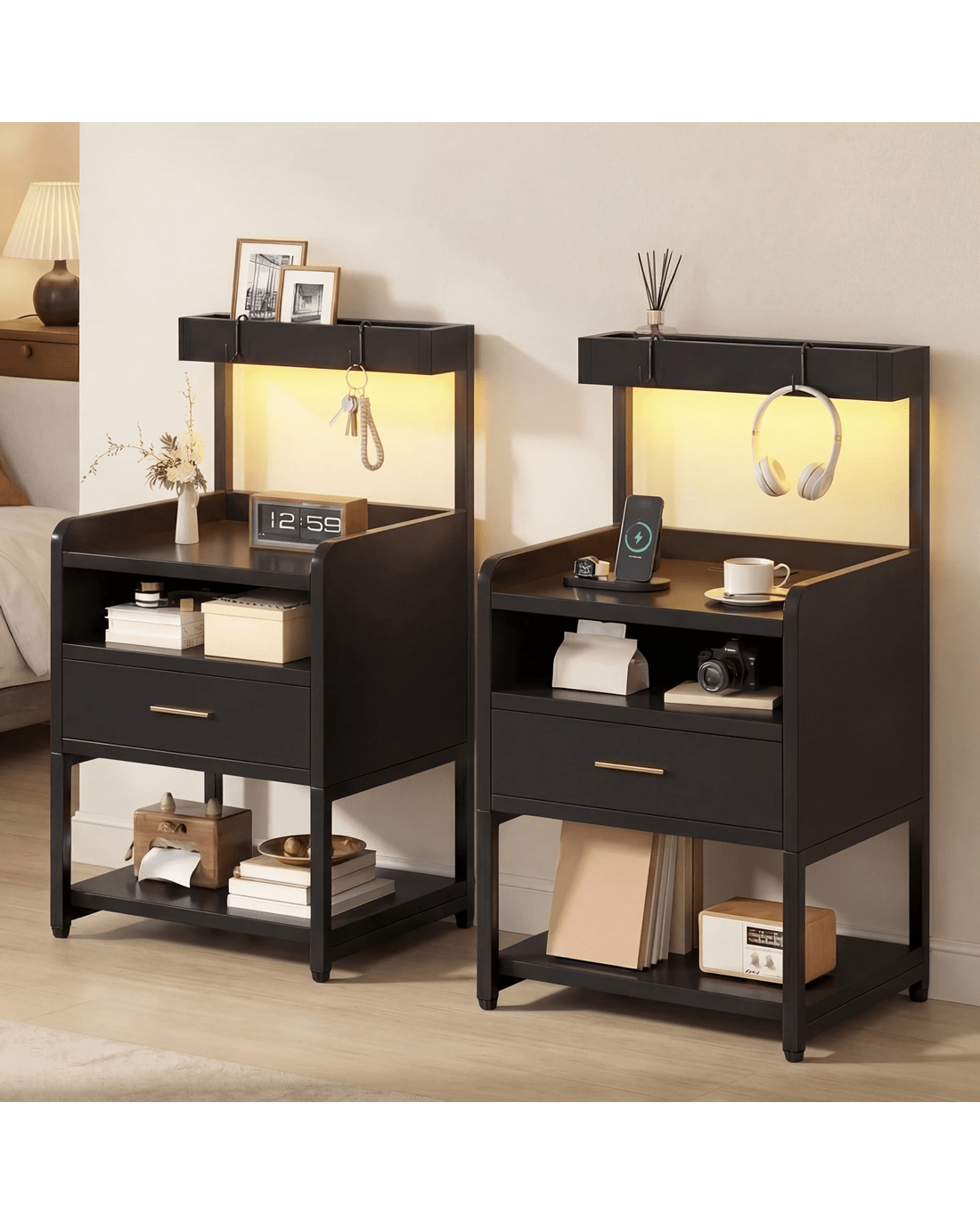 Sold by AdvwinAdvwin Set of 2 Bedside Table with Drawer Charging Station LED Lights - Black