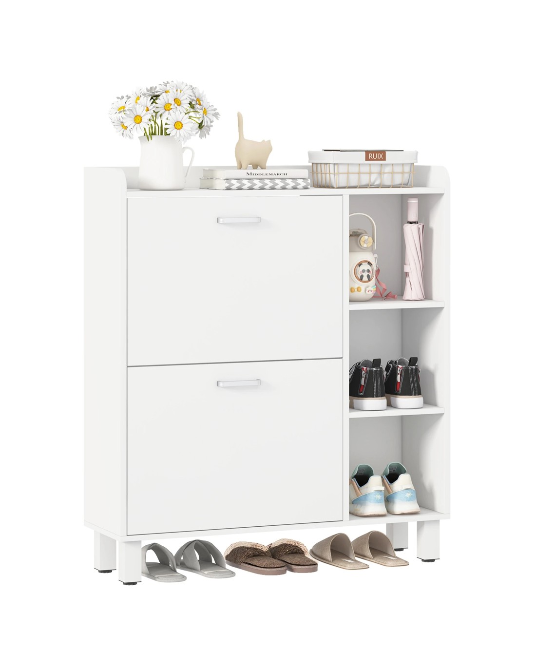 Designed for entryways, the E1 grade particle board and metal legs ensure that the cabinet is sturdy and durable. The cabinet can store different types of shoes, from slippers to short boots, and there is a dedicated space for them. With Advwin shoe cabinets,keep your shoes clean and your entryway no longer cluttered.