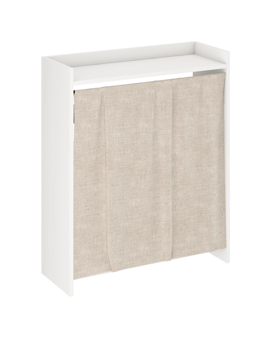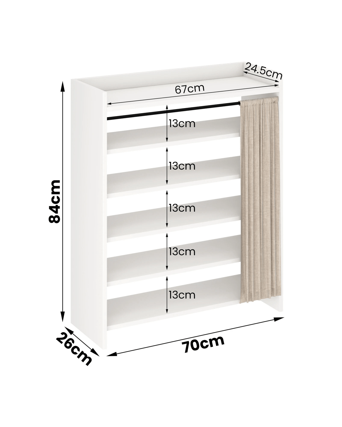 This shoe cabinet features a linen curtain design with a white frame and beige curtain, replacing traditional doors for a warm, dust-resistant, and visually clean look. It offers flexible storage with adjustable shelves and a spacious top, measures 70*26*84cm, and is made from sturdy E1 particleboard with an anti-tipping device for safety. Multifunctional and space-saving, it suits small entryways and is easy to assemble and maintain.