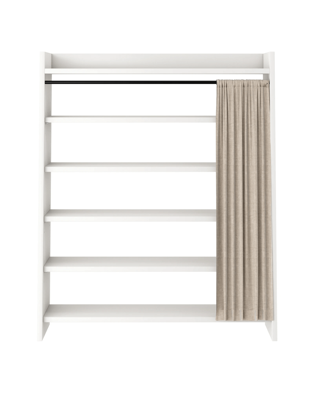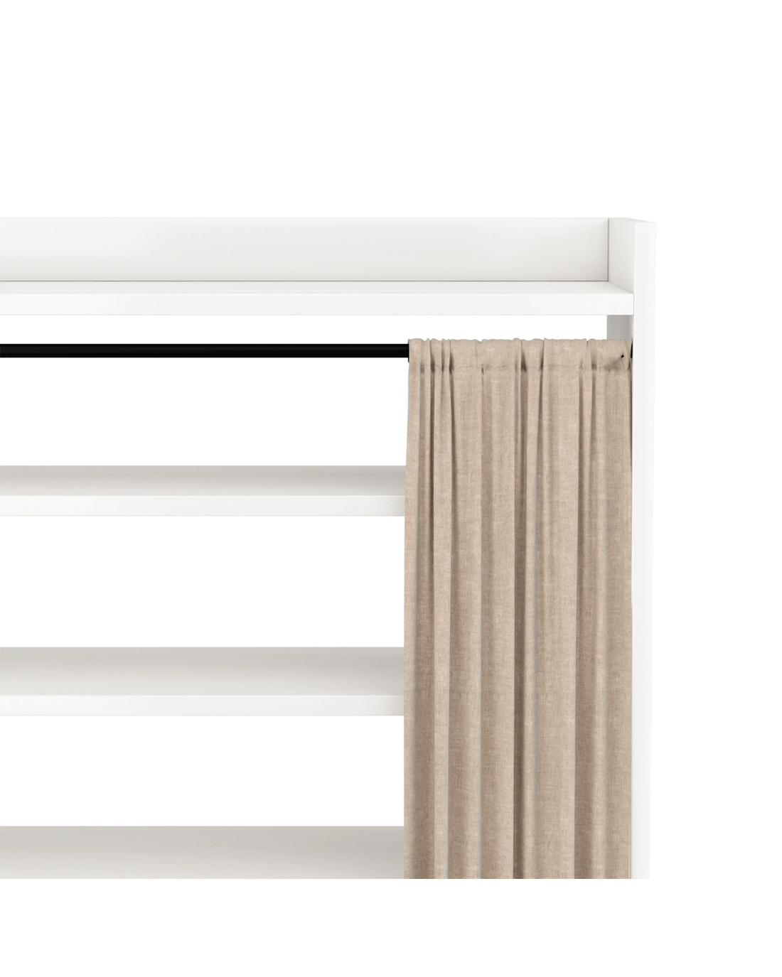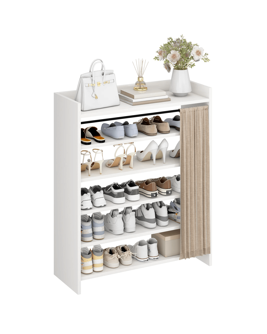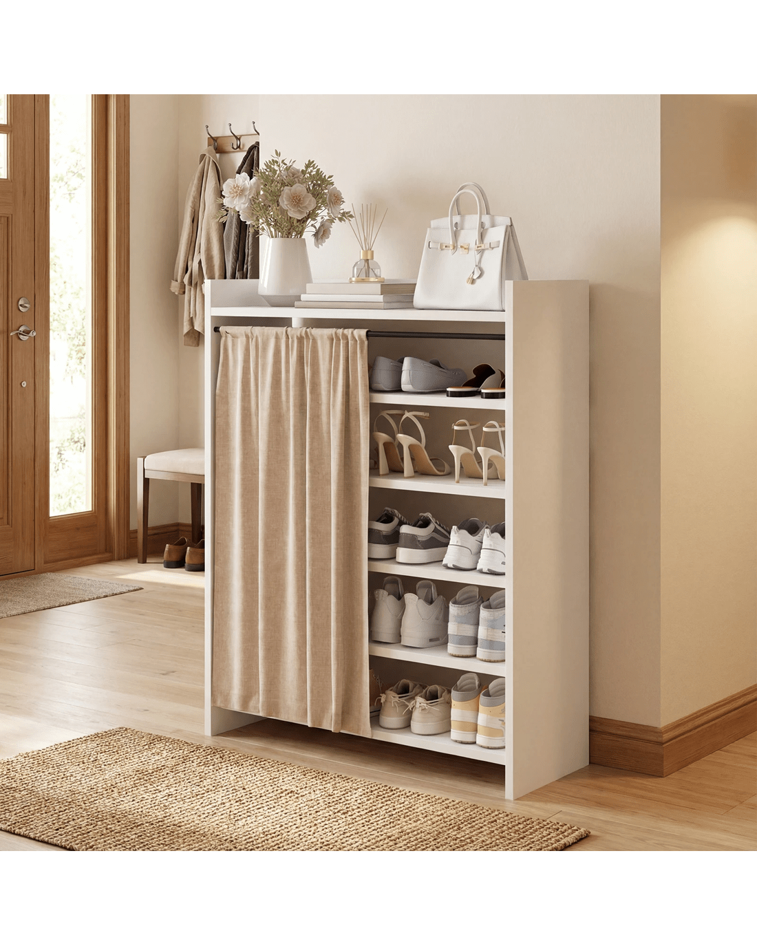Linen Curtain Design: A minimalist white shoe cabinet paired with beige linen curtains blends seamlessly with various home décor styles. The beige linen curtains replace traditional cabinet doors, creating a warm and comfortable atmosphere. They effectively prevent dust from entering the shoe cabinet while providing a cleaner visual effect. Simply pull back the curtain for easy access to shoes, avoiding noise and hassle.
