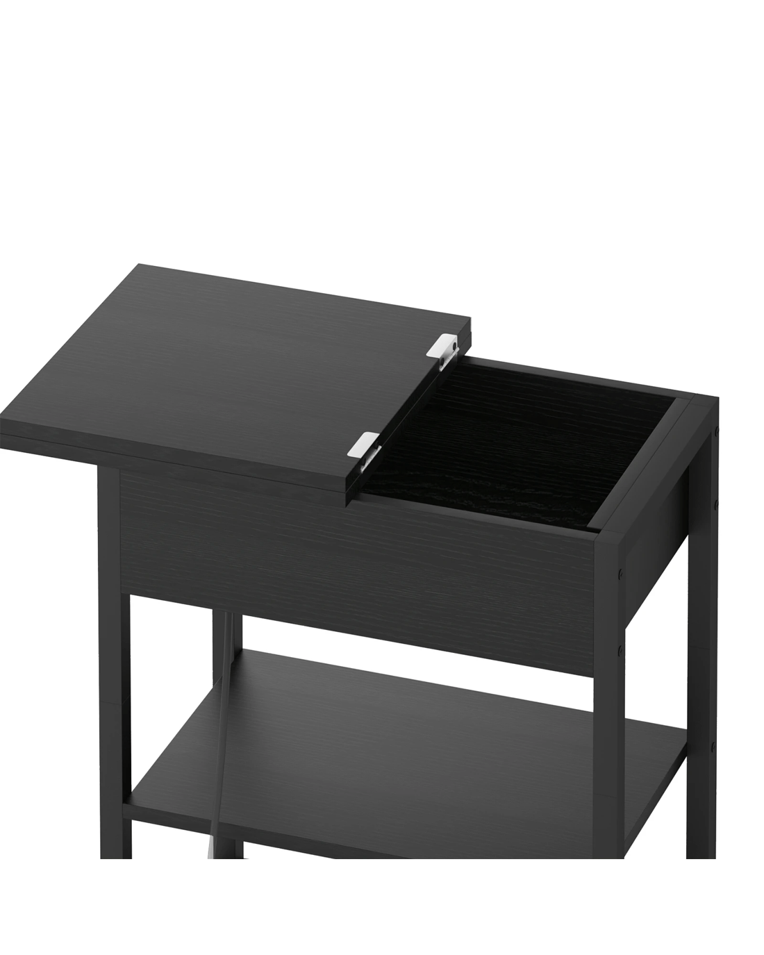 The couch side table features a unique flip-top top that offers hidden storage space, keeping clutter out of sight. The open lower shelf provides additional display or storage options for items like books or decorations, helping keep your space organized and tidy.