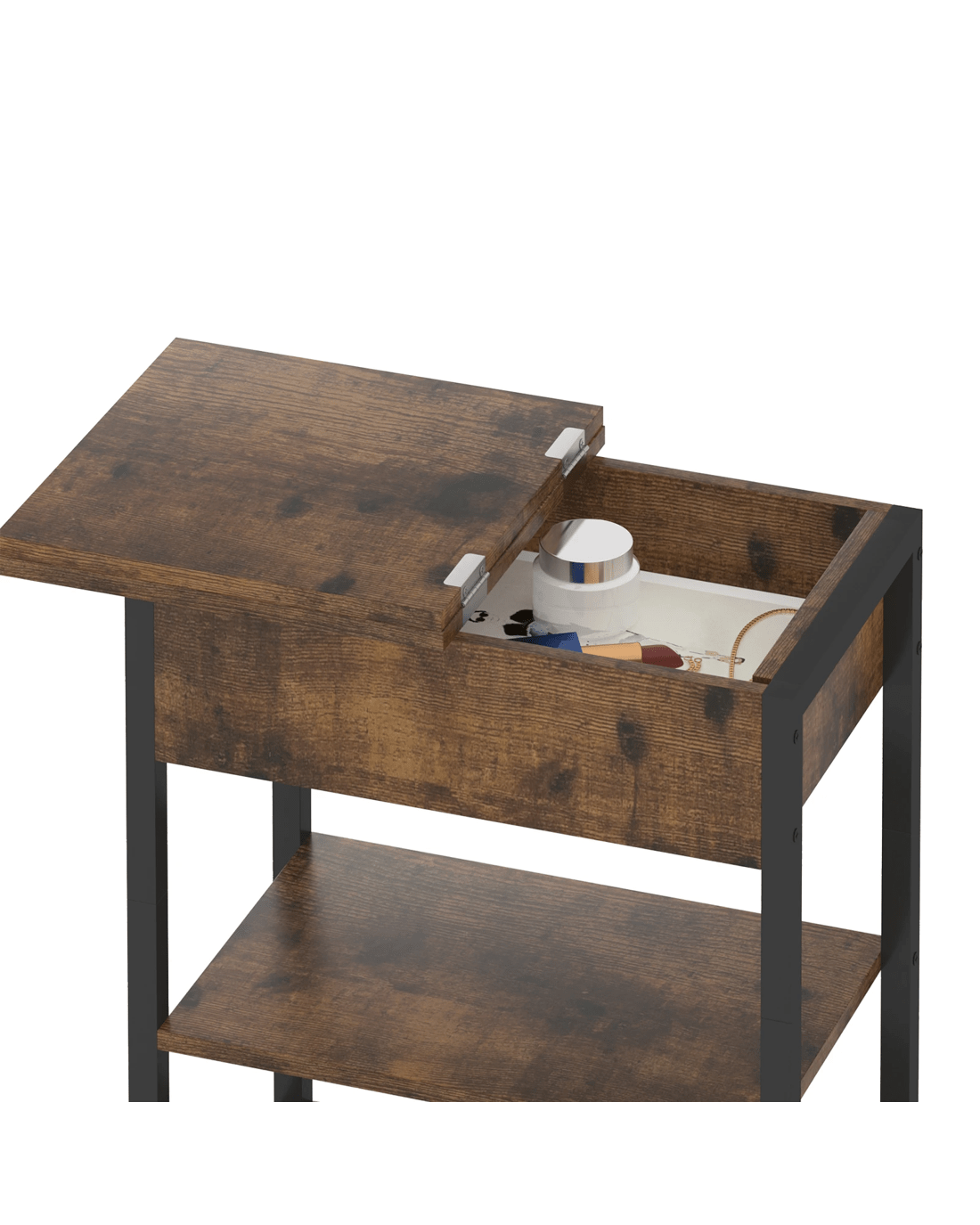 The unique flip-top top offers hidden storage, while the open shelf below lets you display items like books or decor.