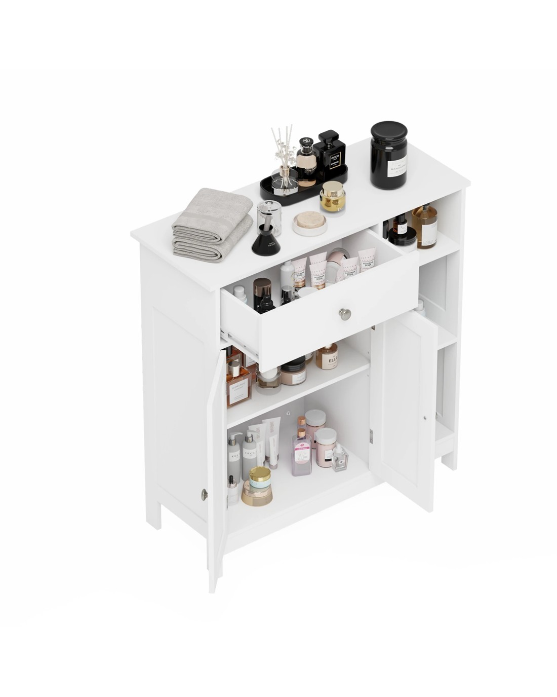 Large Storage Space: This storage cabinet is equipped with a large drawer, a double door closed space, and three open compartments, giving you ample storage space, convenient for partitioning and storing any items you want to put.