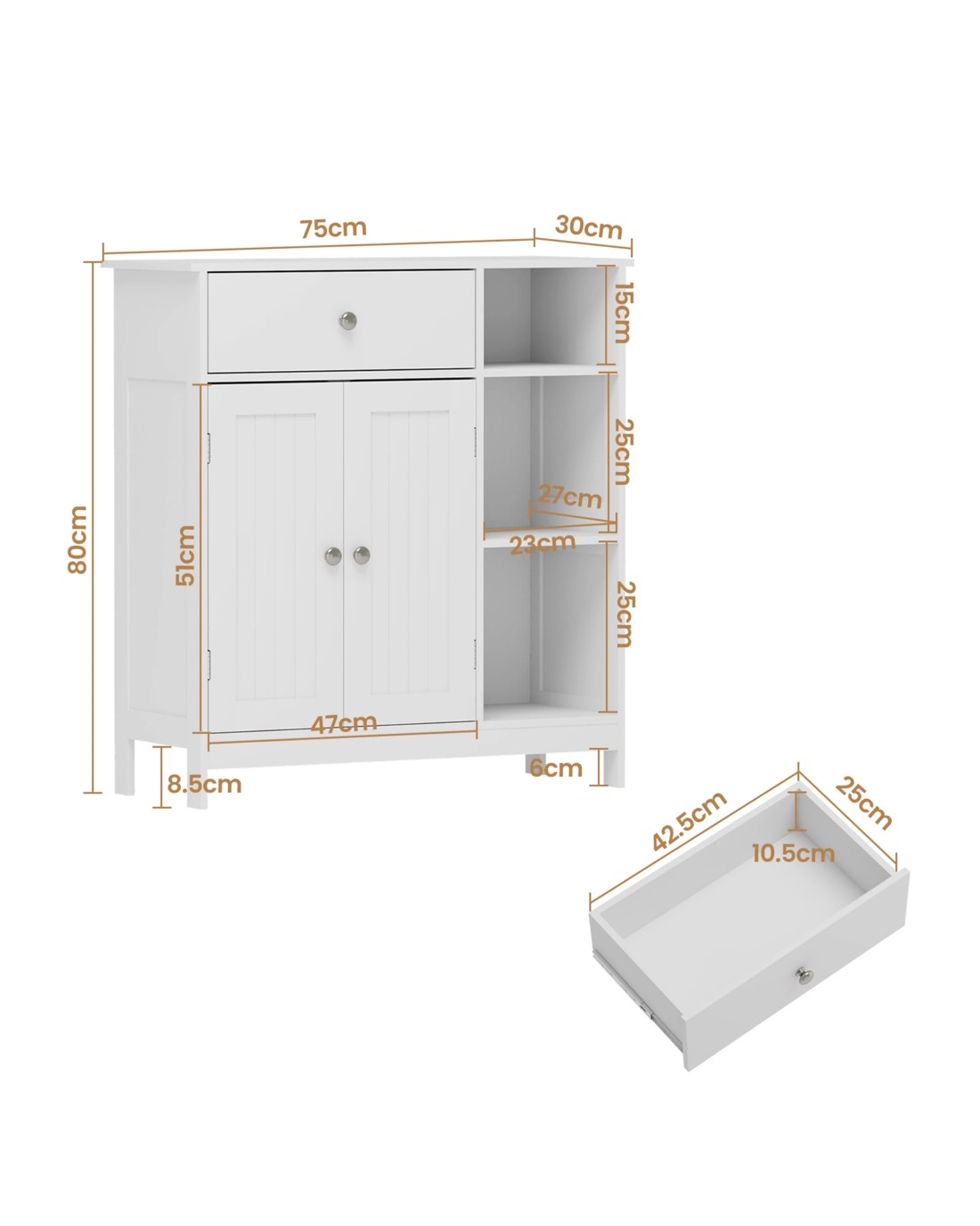 We ensure that all products are made of durable materials and can fit perfectly in the bathroom space. The cabinet can also be placed in the bedroom, kitchen, living room, entryway, office or children's room.