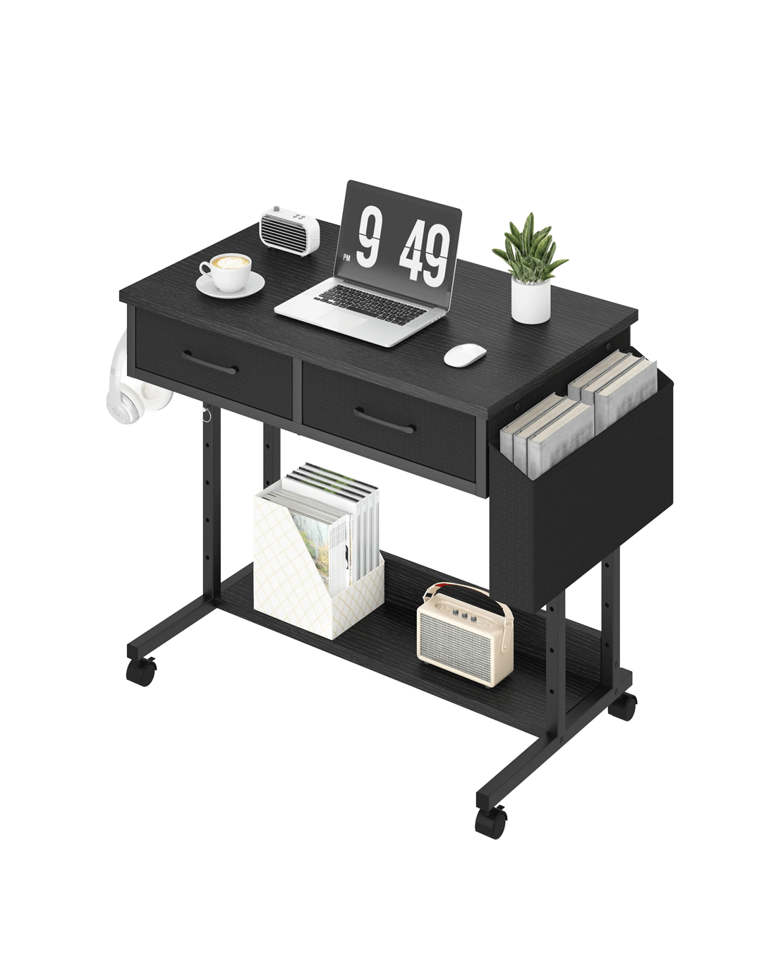 The small computer desk offers ample storage space with 2 fabric drawers and 1 storage shelf. It also features 1 side storage bag and 2 iron hooks, perfect for magazines, notebooks, bags, or small electronics.