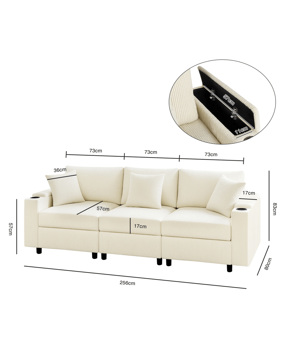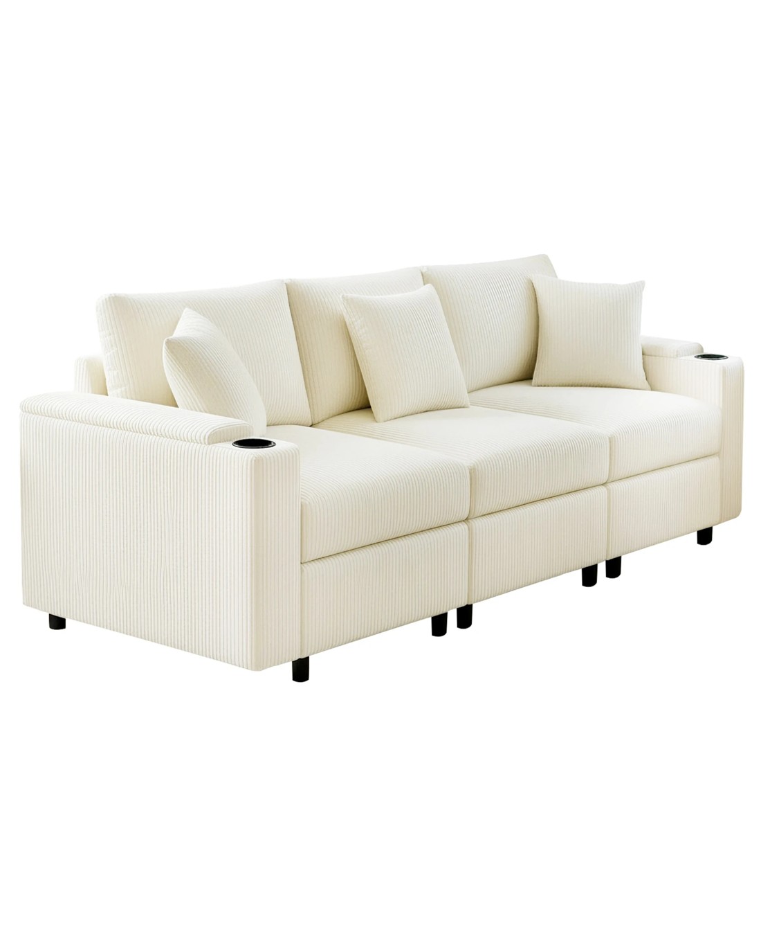 High-end Texture: Our corduroy sofa will become your favorite place to relax in your home. The cream sofa is made from corduroy fabric that is soft to the touch while providing a furry texture. Advwin sofa armrests come with hidden storage and cup holders, creating the perfect environment for casual living.