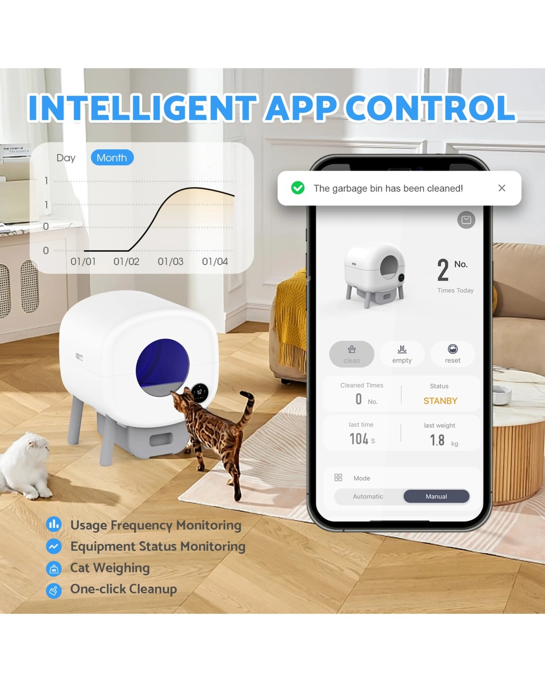 Monitor litter usage, schedule cleanings, and customize settings remotely. Receive real-time notifications for effortless management.