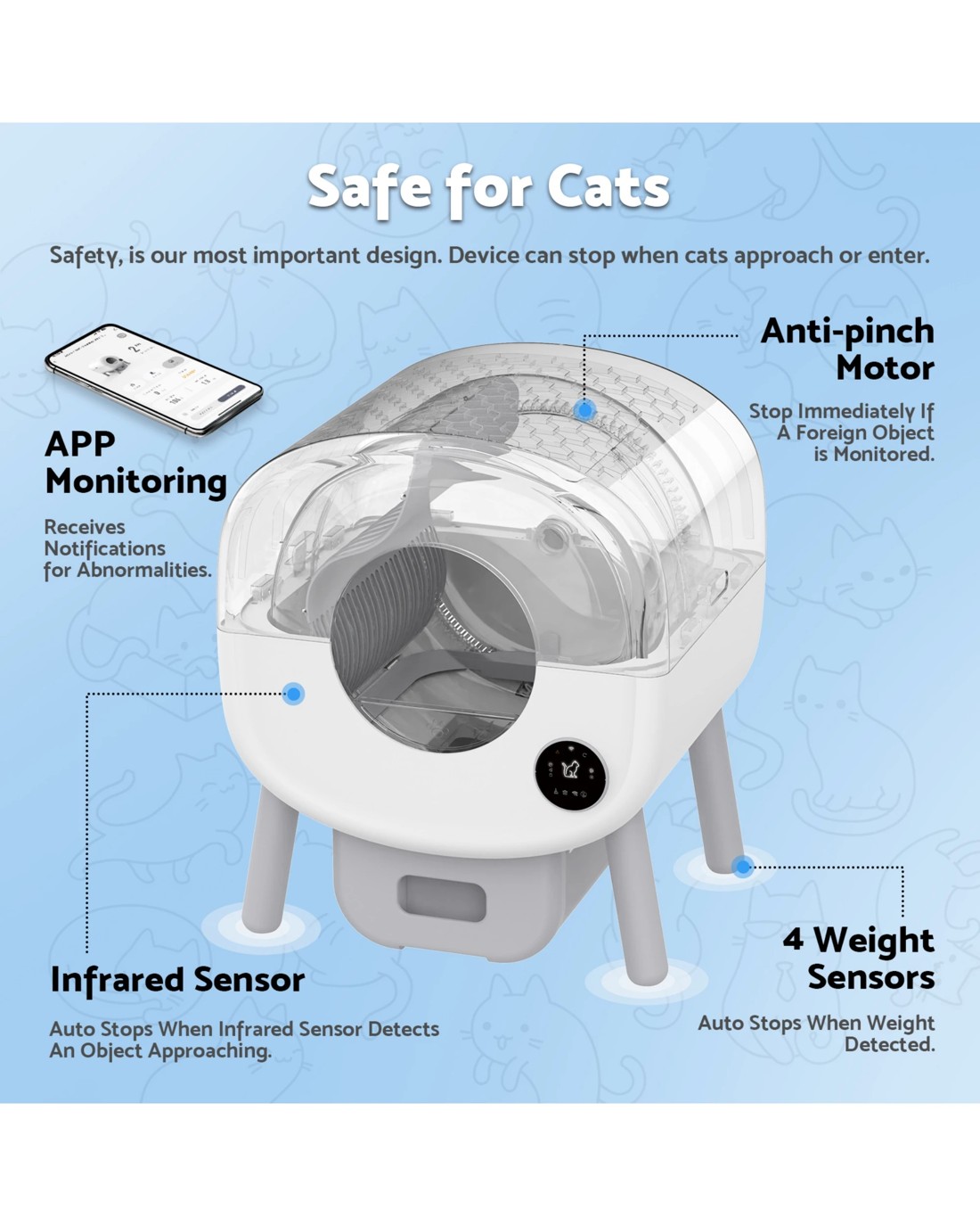 No more scooping! Self-empties quietly after each use with efficient cleaning cycles. Enjoy pristine litter 24/7 without lifting a finger.