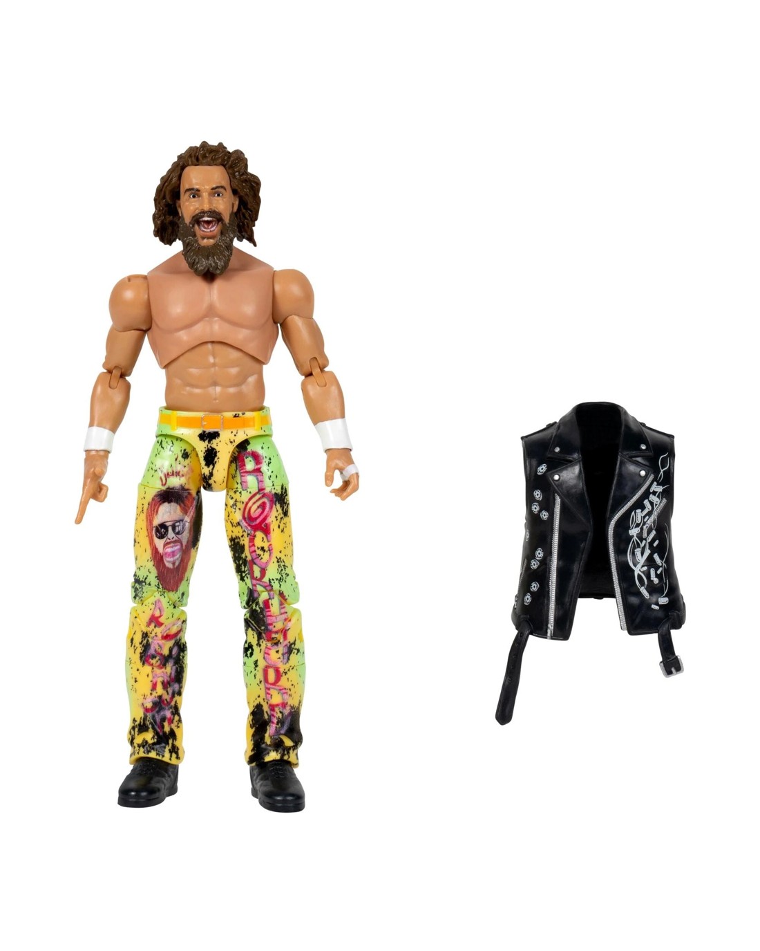 The Juice is loose! The AEW line gets Rock Hard with the Jazwares debut of Juice Robinson in AEW Unmatched Series 12! Juice joins the line with an energetic headscan featuring wild long hair and a long beard. He comes wearing vibrant green-and-yellow belted pants with a black paint splatter effect, Rock Hard Juice Robinson print, and illustrated caricature design. Robinson also comes with removable black sunglasses. He's ready to represent the Bang Bang Gang with an additional gesture hand for posing and a molded black biker vest with bullet shell and bullet hole illustrated designs! Ages 8 +
