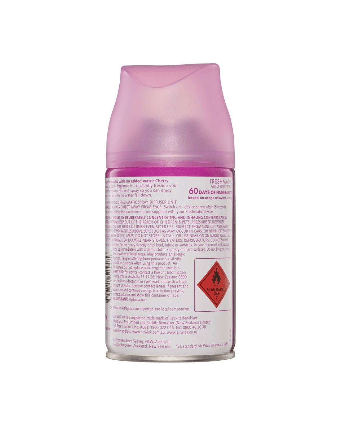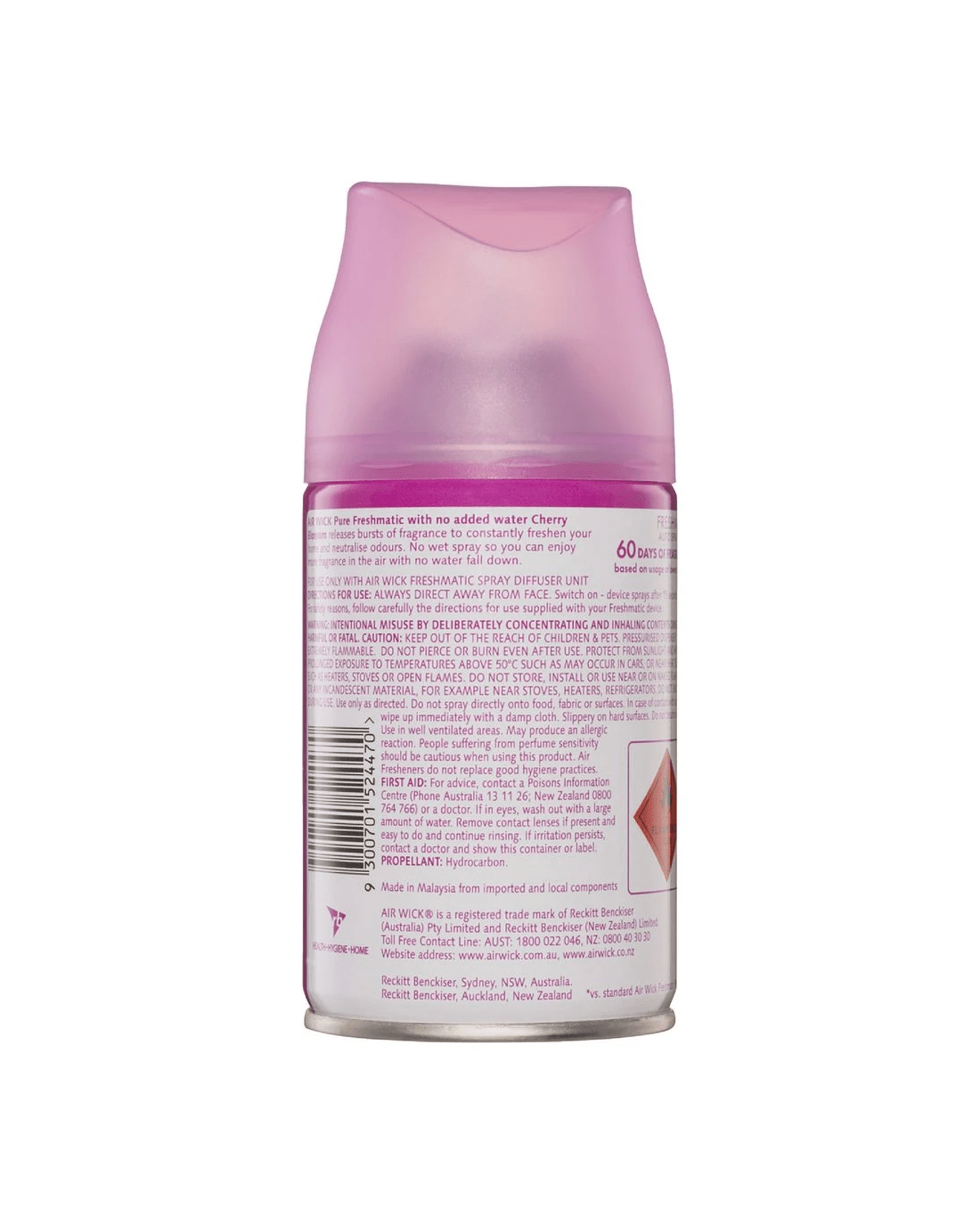 This Air Wick Pure Freshmatic Refill is designed to work with your existing Air Wick Freshmatic System, providing up to 60 days of fragrance. It has a cherry blossom scent and is ideal for use in spaces such as the bathroom, laundry, workspace, and living room.