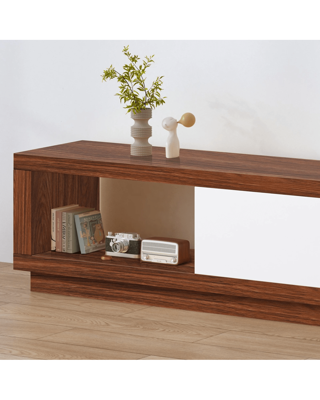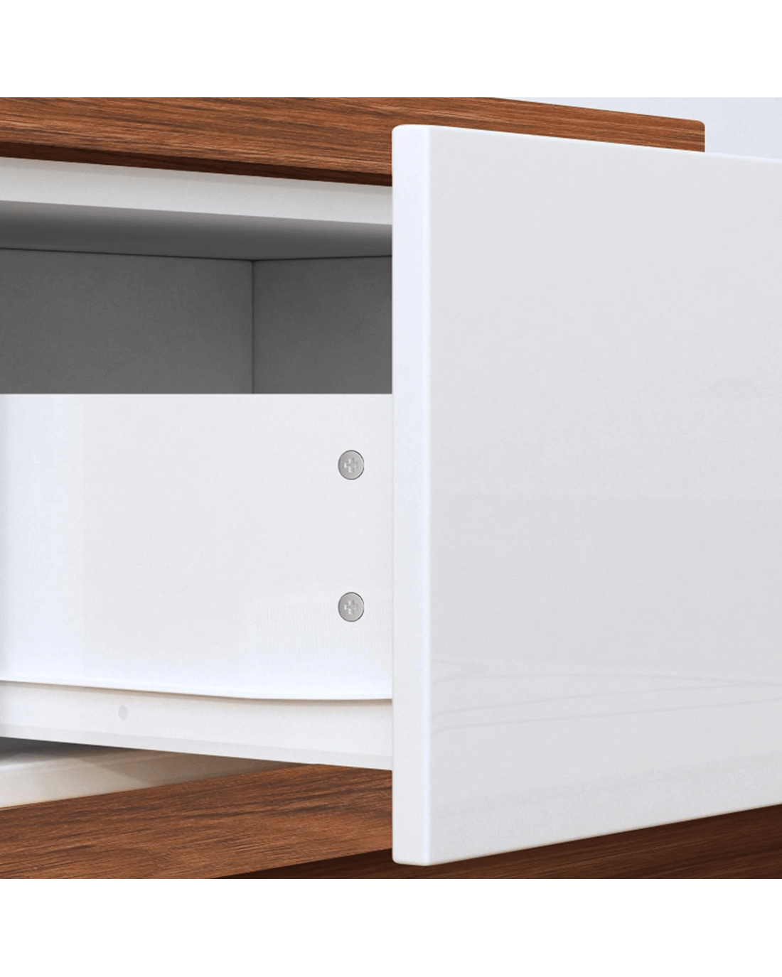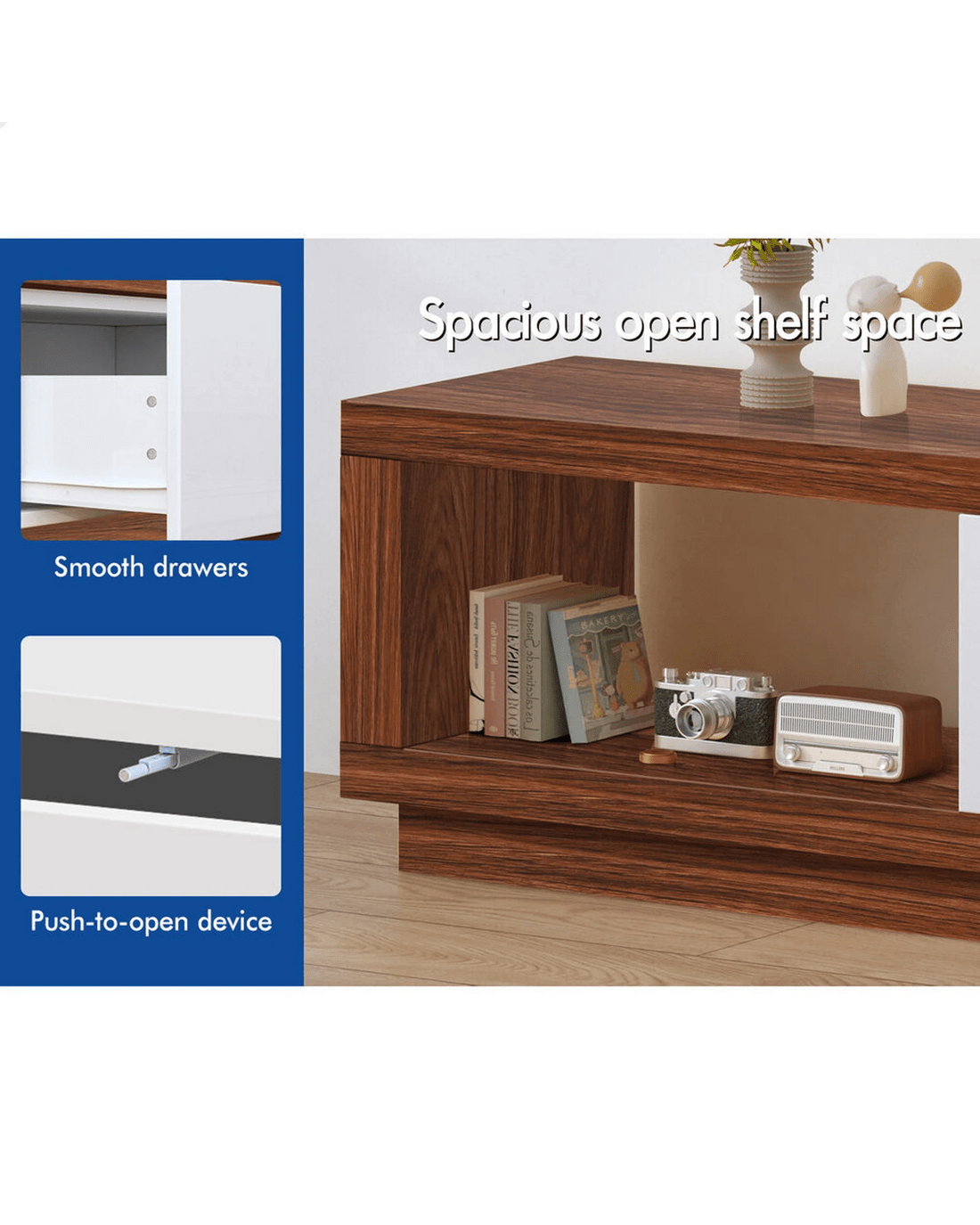 Reliable quality - Made of superior 15mm thick board, our entertainment unit is durable and resistant to scratches. Instead of flimsy paper finish, it is well made with smooth melamine finish which is easy to maintain and long lasting. Equipped with qualified sliding rails and push-to open device, the drawers quietly open and close so you can access your items with ease.